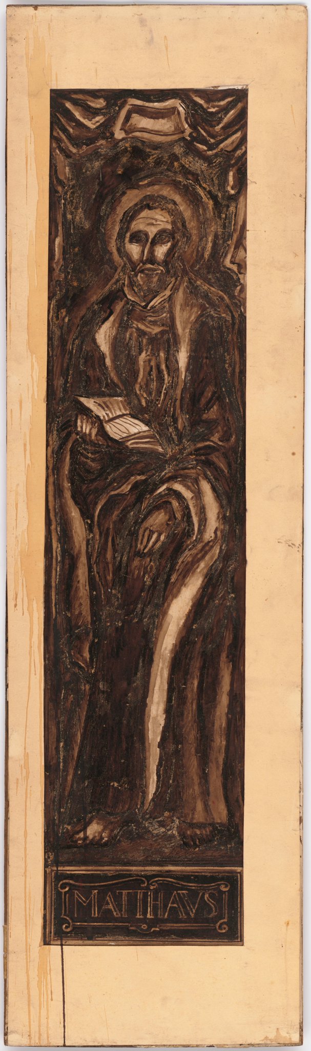 Saint Matthieu en pied, tenant son Évangile ouvert.