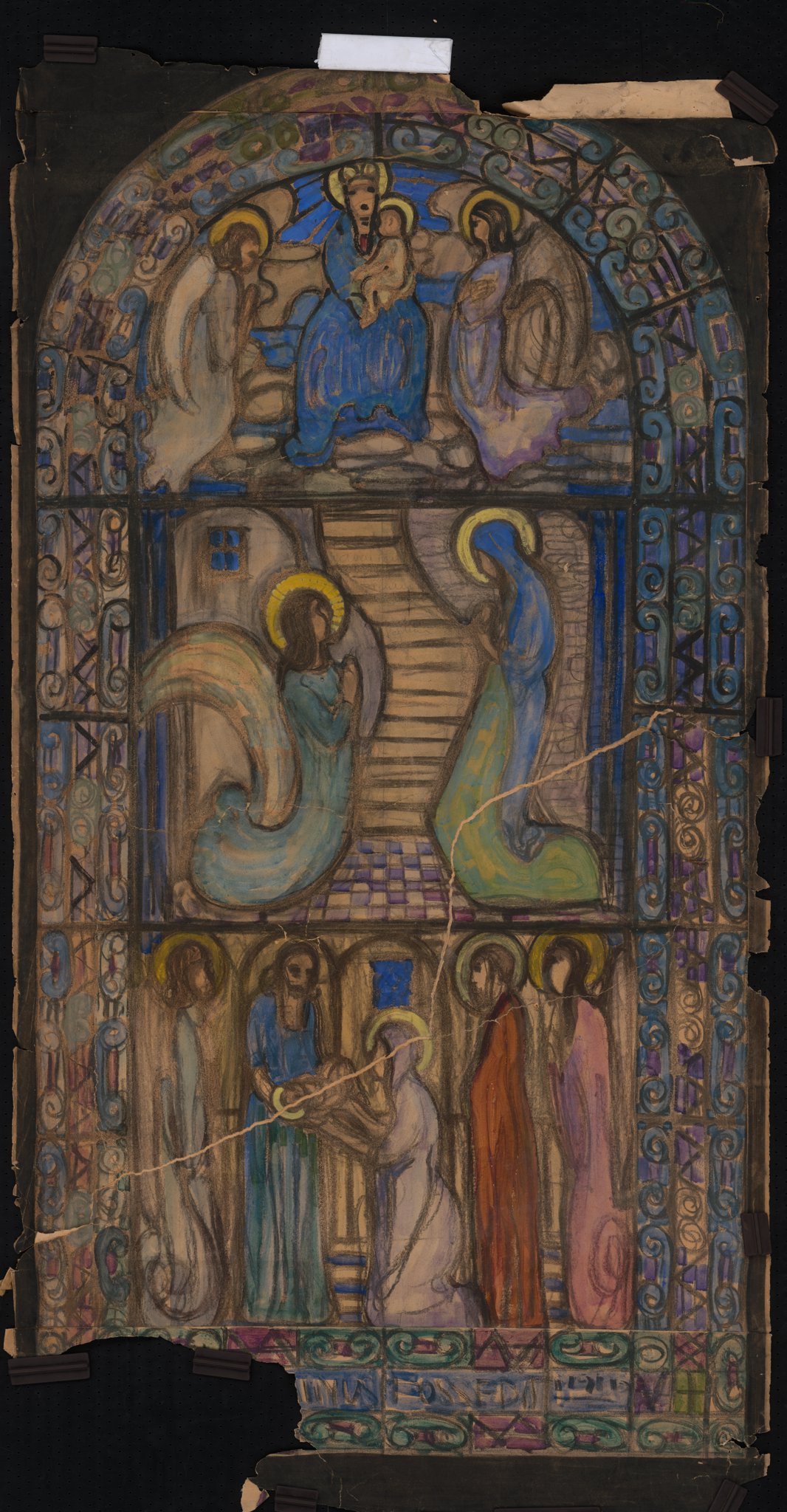 Ce travail préparatoire a été réalisé par Marcel Poncet en 1915 pour le vitrail dédié à la Vierge (GE_08.10), situé dans le bas-côté sud-est de l'église Saint-Paul de Cologny (GE), dans le quartier de Grange-Canal. Il s'agit d'une esquisse en couleur de l'ensemble du vitrail, représentant la Vierge à l'enfant en gloire dans la partie supérieure, l'Annonciation au centre et la Présentation au temple en bas.