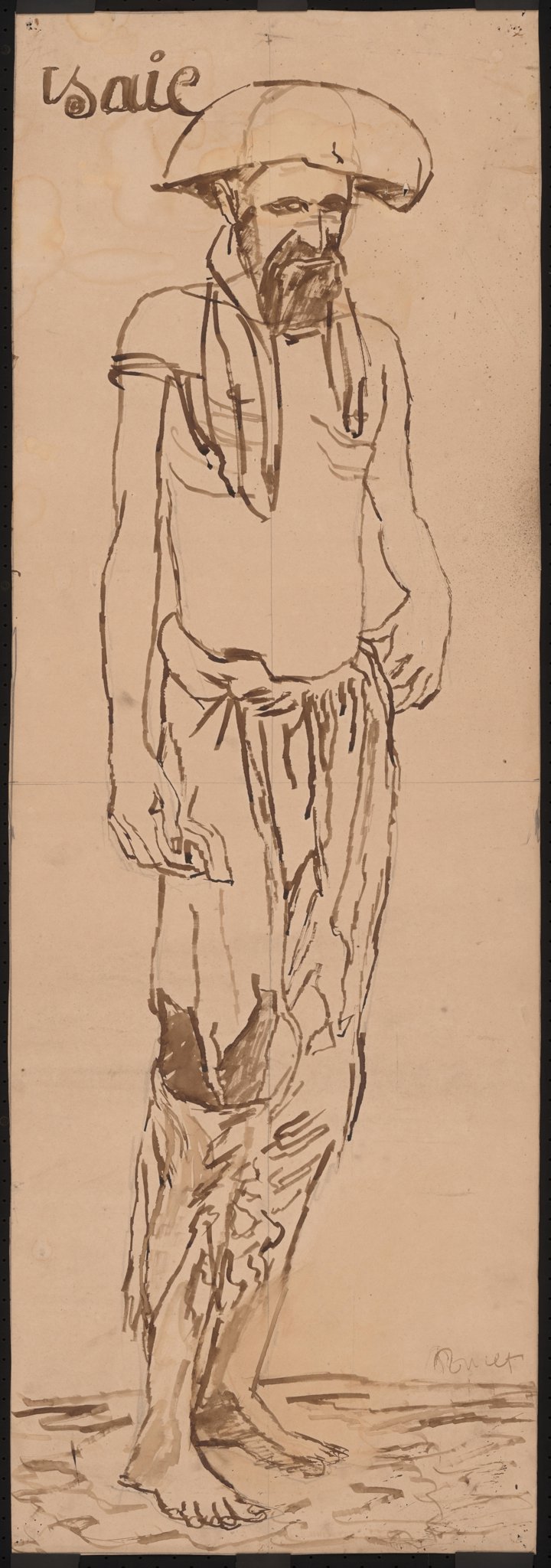 Isaïe en pied, torse nu et son vêtement déchiré en bas, avec un chapeau ovale, et un tissu sur les épaules.