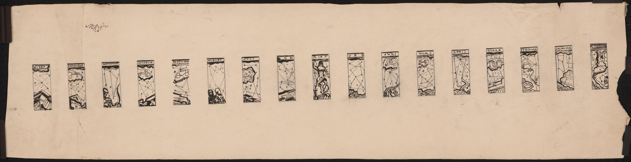 Projet de 17 vitraux sur le thème de la "carte du ciel" : De droite à gauche : la constellation de la Lyre représentée sous les traits d'un roi levant le bras en bas à droite ; le mois de janvier et la constellation du Verseau ; le mois de février avec la représentation des Poissons ; le mois de mars avec la représentation du Bélier en haut, le mois d'avril avec la représentation du Taureau en bas à droite ; le mois de mai et le symbole des Gémeaux en haut ; le mois de juin et le symbole du Cancer en haut, la représentation de la constellation de la Licorne en bas ; les trois fenêtres centrales sont dédiées au Christ assis levant le bras droite, entouré de constellations et surplombant une montagne ; le mois de juillet et le symbole du Lion; août et la représentation de la Vierge ailée en bas à gauche ; septembre et le symbole de la Balance (?) en haut ; octobre et le symbole du Scorpion; novembre et la représentation du Sagittaire en bas à gauche ; décembre et la représentation du Capricorne (?) en bas devant une sorte de temple. La dernière fenêtre avec la prolongation du temple en bas, complète la carte du ciel avec la date de 1937 au sommet. L'ensemble des fenêtres est parcouru des représentations des constellations en arrière plan, reliées par des droites.