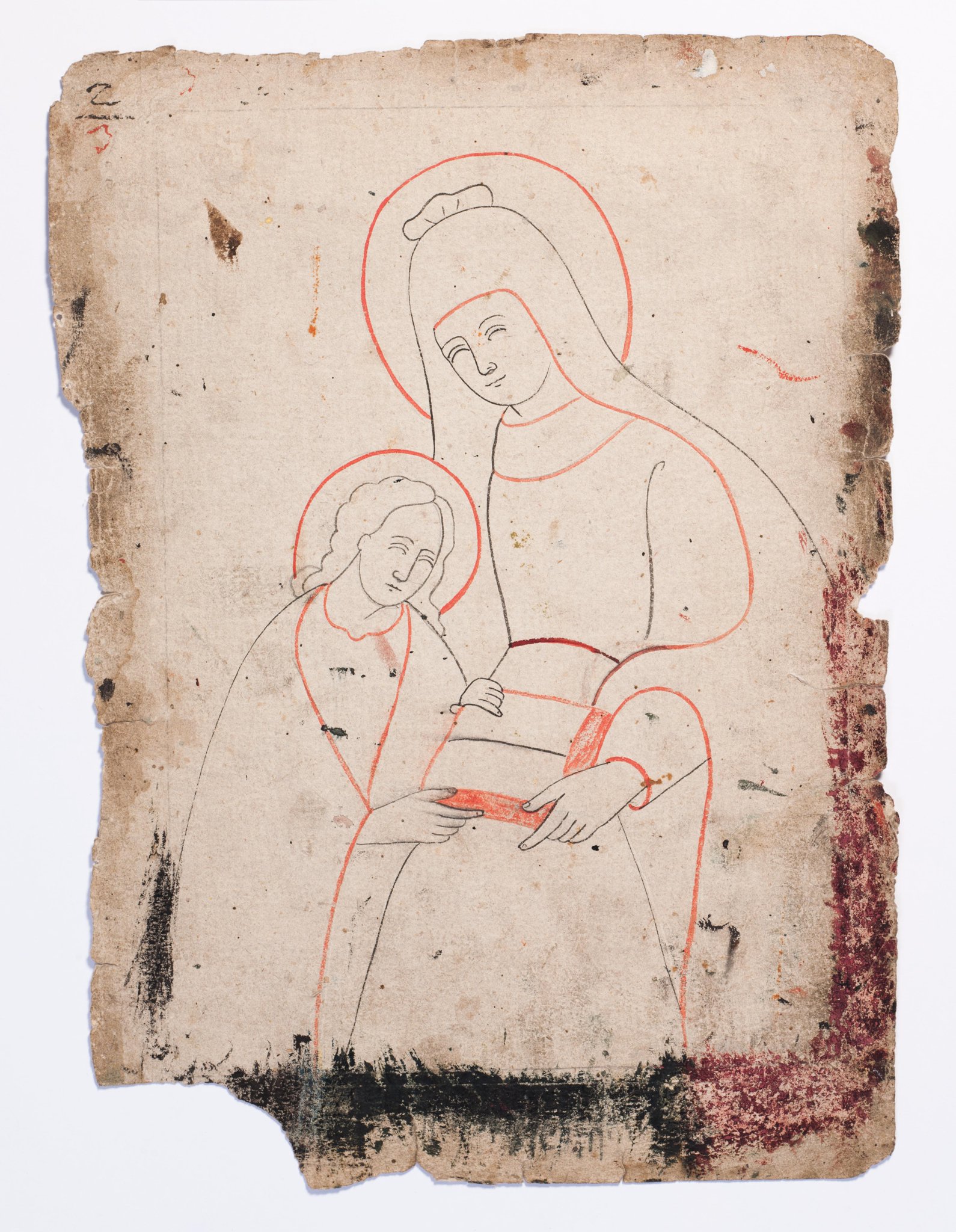 Im Dreiviertelprofil beugt sich links Maria über das aufgeschlagene Buch, das auf dem Schoss der ihr zugewandten Mutter Anna liegt. Sie fährt mit der linken Hand auf der linken Seite einer (nicht dargestellten) Zeile entlang. Beide Figuren sind nur in schwarzen und roten Konturen und ohne Faltenwurf dargestellt.