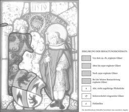 Ein Teil des Wappens, der Helmdecke und der Helmzier sowie ein kleines Stück oben am linken Rand neu ergänzt; Sprungbleie; die Verbleiung erneuert.