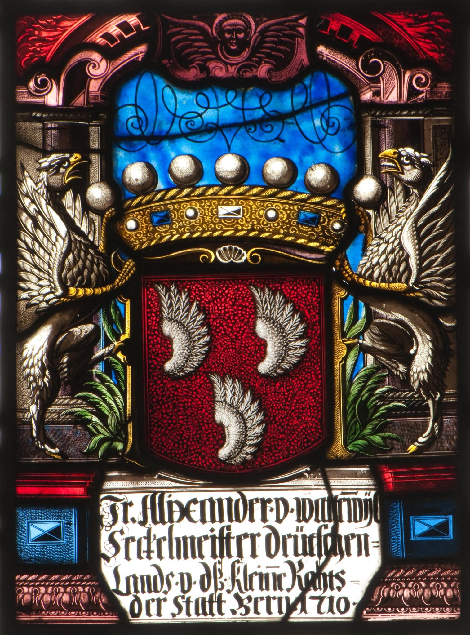 Vor wolkig blauem Grund präsentieren zwei Greifen das mit einer Freiherrenkrone bekrönte, blattumkränzte Wappen des Alexander von Wattenwyl. Dahinter erhebt sich eine Rahmenarkade aus grauen Pilastern mit vorgesetzten Rundpfeilern und einem rollwerkverzierten, rosafarbenen Flachbogen, dessen Scheitelkartusche ein geflügelter Kopf ziert. Am Scheibenfuss steht an der Front des Podiums die Inschrift mit dem Stifternamen.