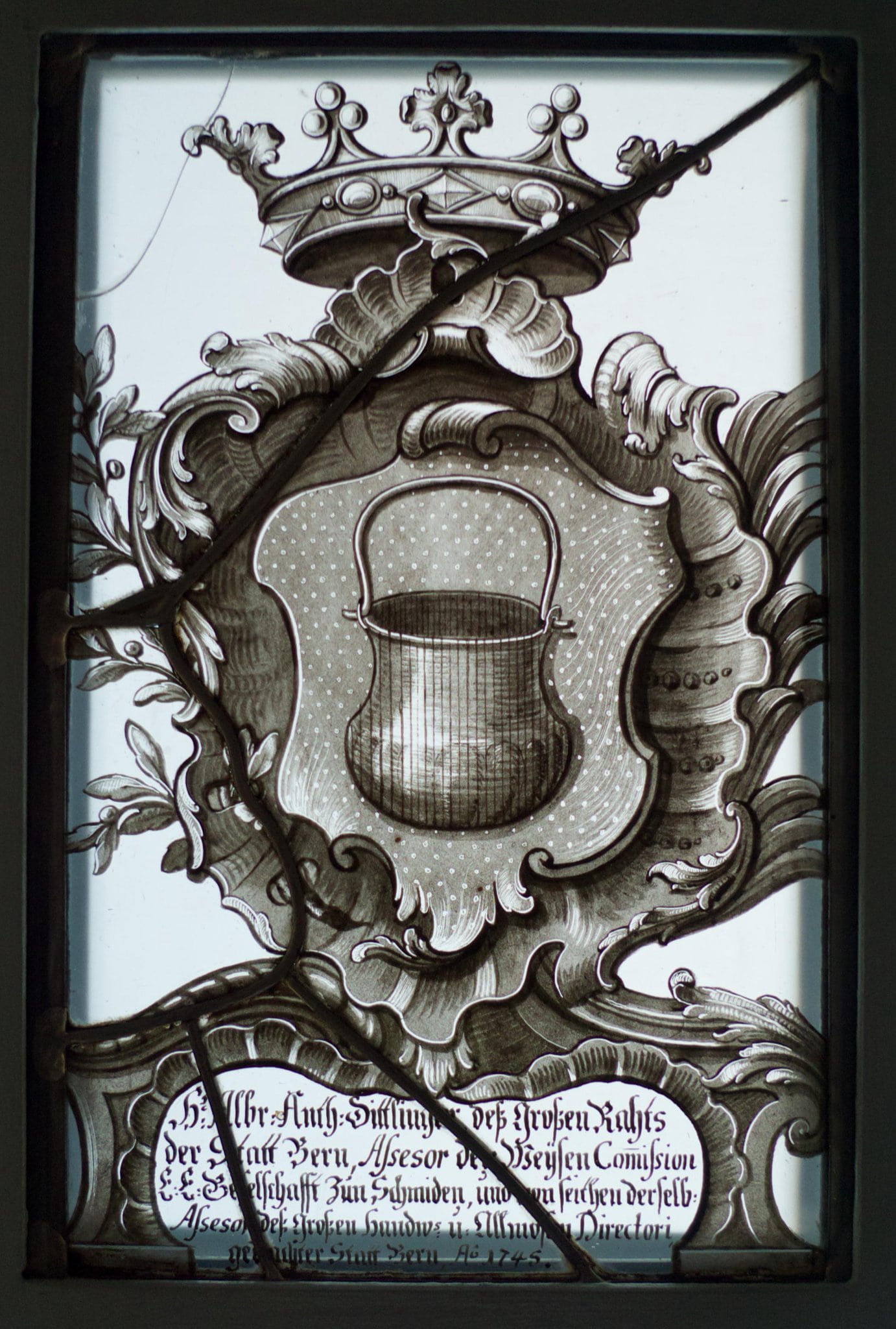Das 1912 abgebrochene Zunfthaus der Berner Gesellschaft zu Schmieden an der Marktgasse wurde ab 1718 über Jahre grundlegend erneuert. Zu den letzten Umbauphasen zählte die 1748 erfolgte Einsetzung neuer Fenster in die vordere "façe" des Gesellschaftshauses. Dabei erbat man sich zum Schmuck der Fenster von den zur Zunft gehörenden Meisterschaften "einiche Lichter samt den Schilten". Laut Paul Wäber kamen in der Folge die Meisterschaften des Kupferschmied-, Hufschmied- und Messerschmiedhandwerks der Aufforderung nach und schenkten je ein Fenster mit ihrer "Schliffscheibe" (Wäber 1938). Bei diesen Schenkungen handelte es sich freilich nicht um Schliffscheiben, sondern um Glasgemälde in Grisaillemalerei. Unter den heute erhaltenen drei Meisterschaftsscheiben findet sich zudem keine des Messerschmiedhandwerks. Vielmehr sind es zwei Stiftungen des Huf- und Waffenschmiedhandwerks von 1739 und 1748 sowie diejenige der Kupferschmiede von 1749. Die Huf- und Waffenschmiede hatten das Gesellschaftshaus demnach bereits bei einer früheren Umbauphase mit einem Glasgemälde beehrt. Die Stiftung der Messerschmiede hingegen dürfte beim Unwetter (Hagelschlag) gegen Ende des 19. Jahrhunderts zerstört worden sein (s. u.). Ausser den drei Glasgemälden der Meisterschaften existieren aus der gleichen Periode sieben weitere Grisaillescheiben mit den Wappen von Gesellschaftsangehörigen. Nach Paul Wäber erfolgten diese Stiftungen, nachdem die Zunft, das heisst die "Committierten zu den Gesellschaftsfenstern", 1750 ein jedes "Ehrenglid" der Waisenkommission um sein Wappen für ein Fenster gebeten hatten. Von den betreffenden Scheiben datieren allerdings lediglich zwei von 1750 und 1751, die restlichen fünf jedoch aus den Jahren zwischen 1745 und 1749. Es ist deshalb davon auszugehen, dass die Zunft bereits gegen 1745 mit der Bitte um Wappengaben an einzelne ihrer Angehörigen gelangt war. Wie viele solche Gaben die Gesellschaft zu Schmieden damals in ihr erneuertes Haus erhielt, weiss man zwar nicht. Es werden aber sicher mehr als die heute noch vorhandenen zehn Glasgemälde gewesen sein.