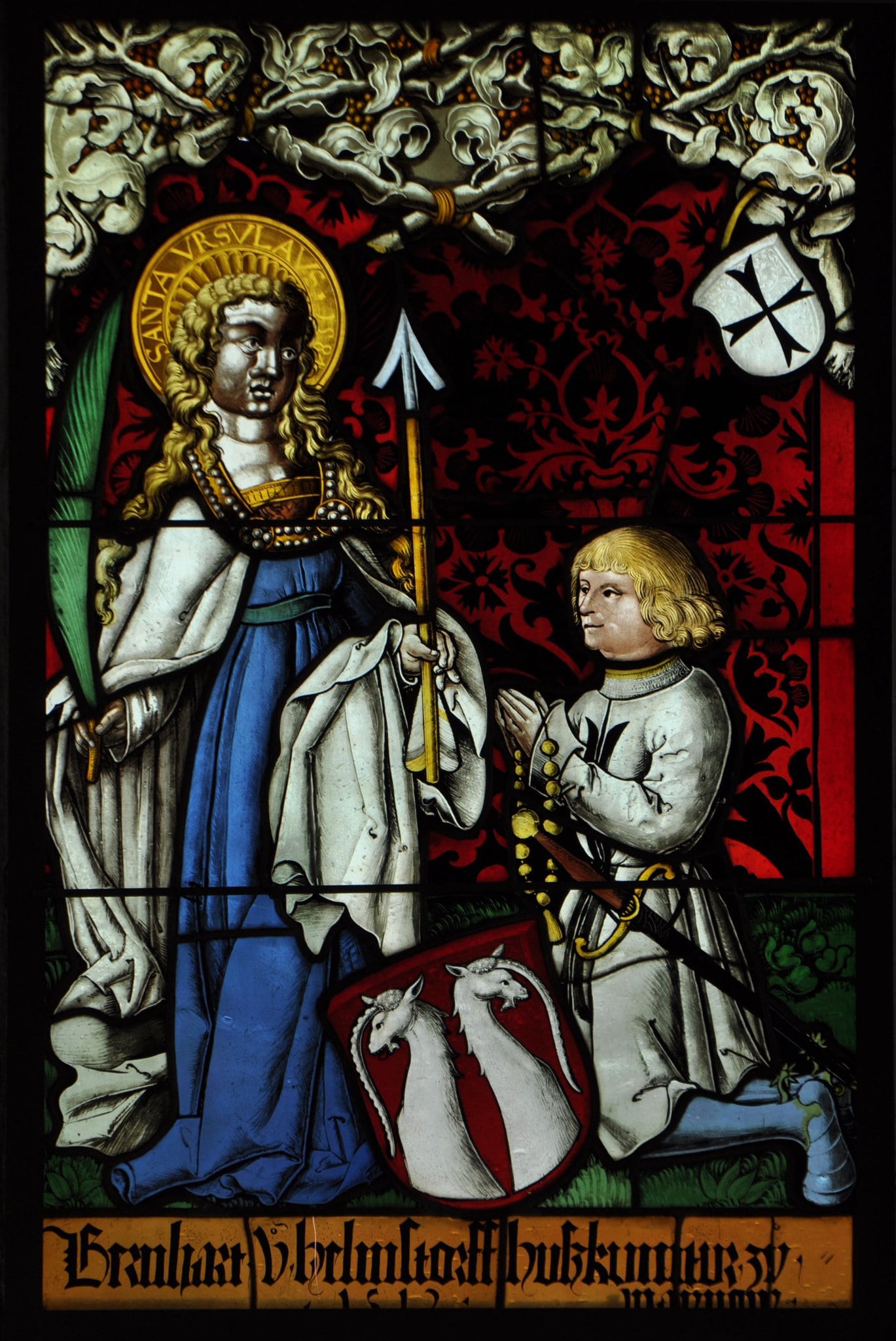 11HH(URSULA) · Ursula von Köln, jungfräuliche Märtyrerin; mögliche Attribute: Pfeil, Banner mit rotem Kreuz, Hermelinmantel, Krone, Schiff