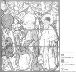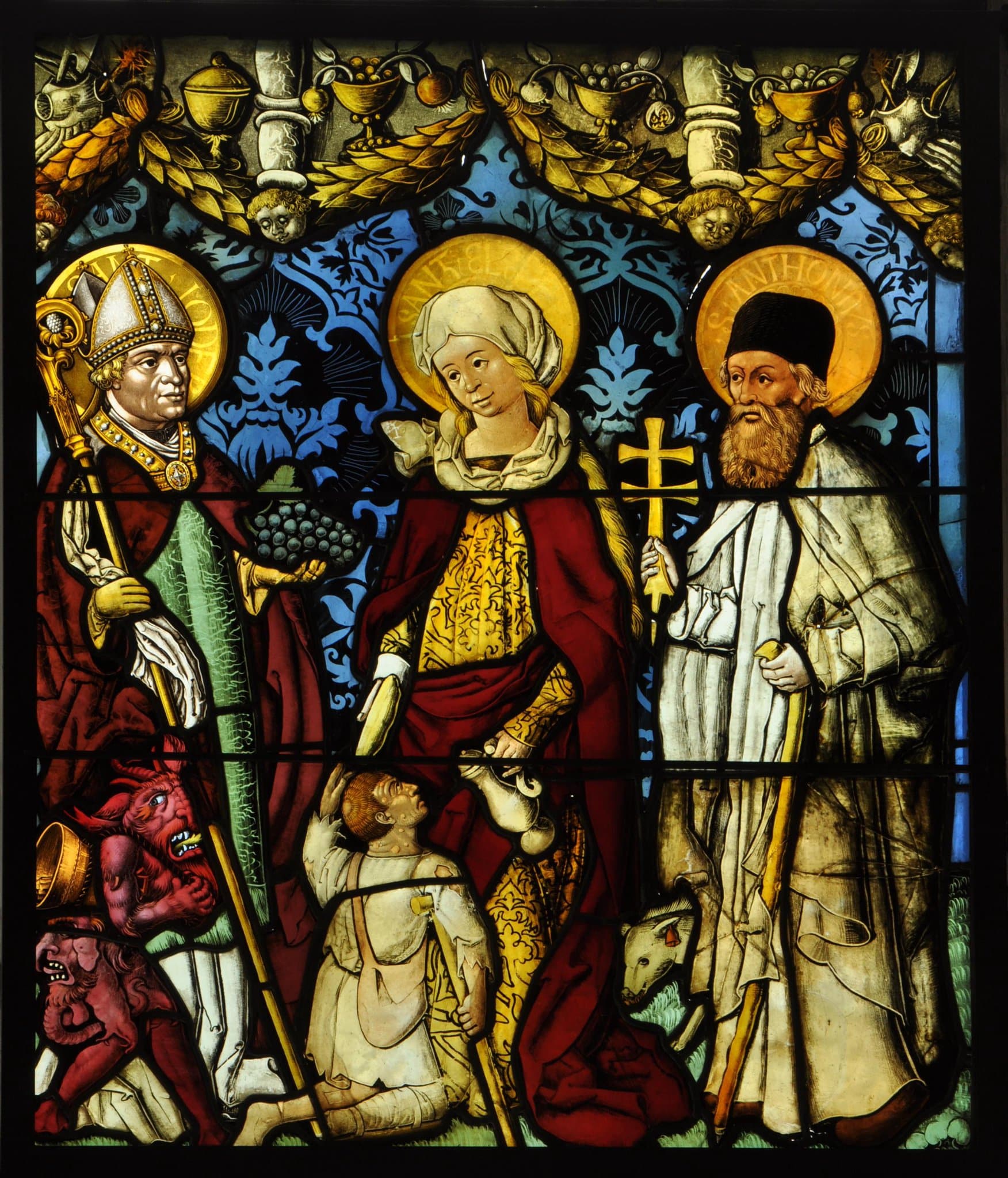 Vor blauem Damastgrund stehen auf grünem Wiesenboden die Heiligen Theodul (Joder), Elisabeth und Antonius. Der hl. Theodul von Sitten trägt den Bischofsornat und hält als Patron der Winzer eine Traube in der Linken (von Kasser als St. Urban angesprochen). Zu seinen Füssen befindet sich der Teufel mit der Glocke, die dieser auf Geheiss des Bischofs nach Sitten tragen musste. Die hl. Elisabeth, gekleidet in ein goldenes Brokatgewand und einen roten Mantel, reicht dem vor ihr knienden Krüppel einen Brotlaib und Wasser im Krug. Der hl. Antonius Eremita hält in seinen Händen T-Kreuz und Pilgerstab. Er wird er von einem Schwein begleitet, das an seinem Öhrchen eine kleine Glocke trägt und an das Privileg des Antoniterordens erinnert, der die Schweine frei herumlaufen lassen durfte. Über den Figuren ist eine mit Fruchtschalen besetzte gelbe Blattgirlande aufgehängt. Die Stifterinschrift am Scheibenfuss ist nicht erhalten.