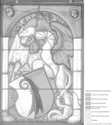 Die beiden oberen Bogenstücke, der linke Flügel des Basilisken und die rechte Hälfte des Basler Wappenschildes neu ergänzt; zwei alte Flickstücke Mitte des unteren Randes und ein weiteres oben im Damast; ein Sprung und einige Sprungbleie; die Verbleiung erneuert.
