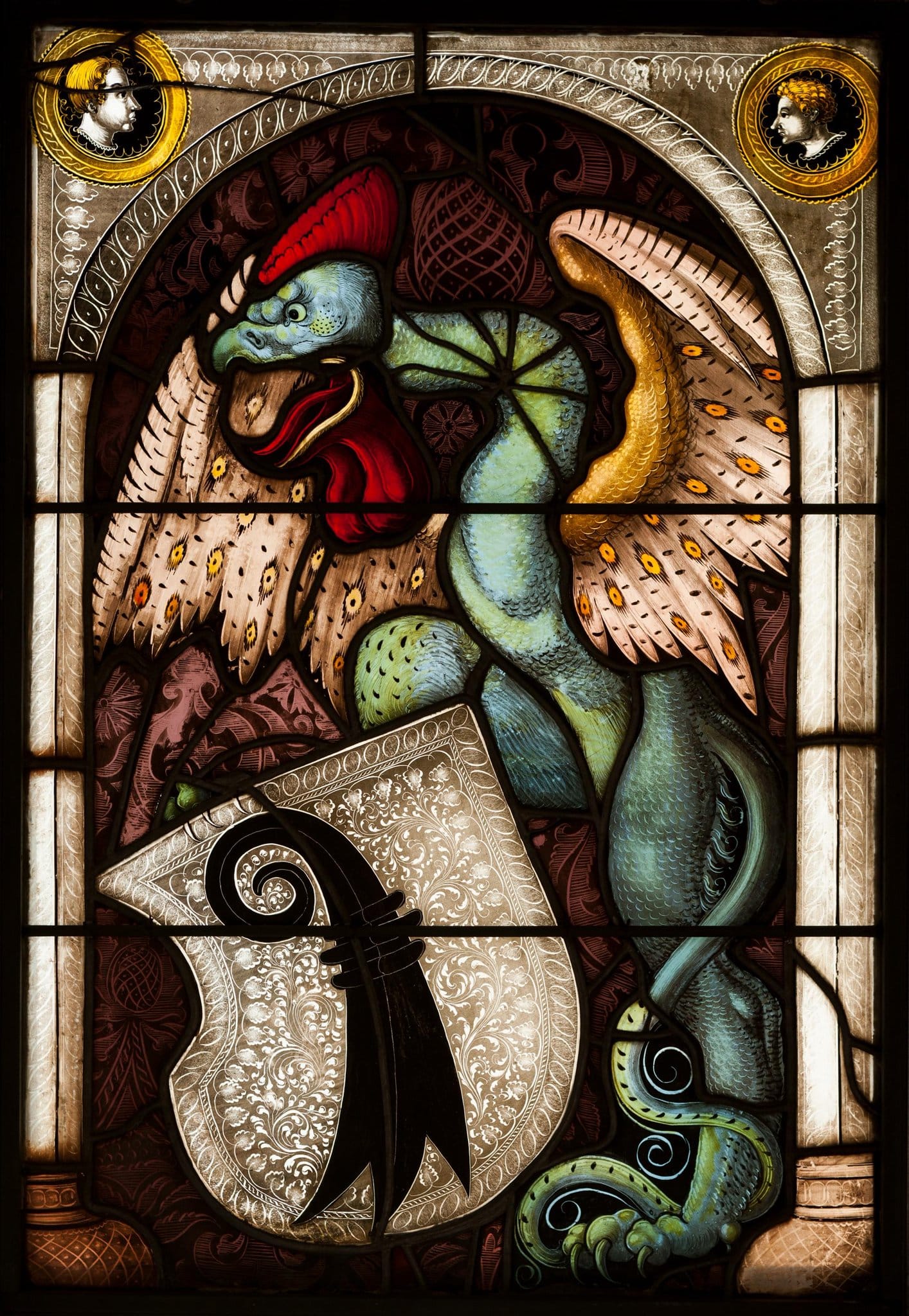 Vor violettem Damastgrund erscheint ein riesenhafter, blau und grün schillernder Basilisk als Wächter des Basler Schildes. Die Darstellung umfasst eine einfache Steinarkade, deren Zwickelfelder zwei Medaillonköpfe zieren. Es handelt sich um das gegengleiche Stück zum Pendant.