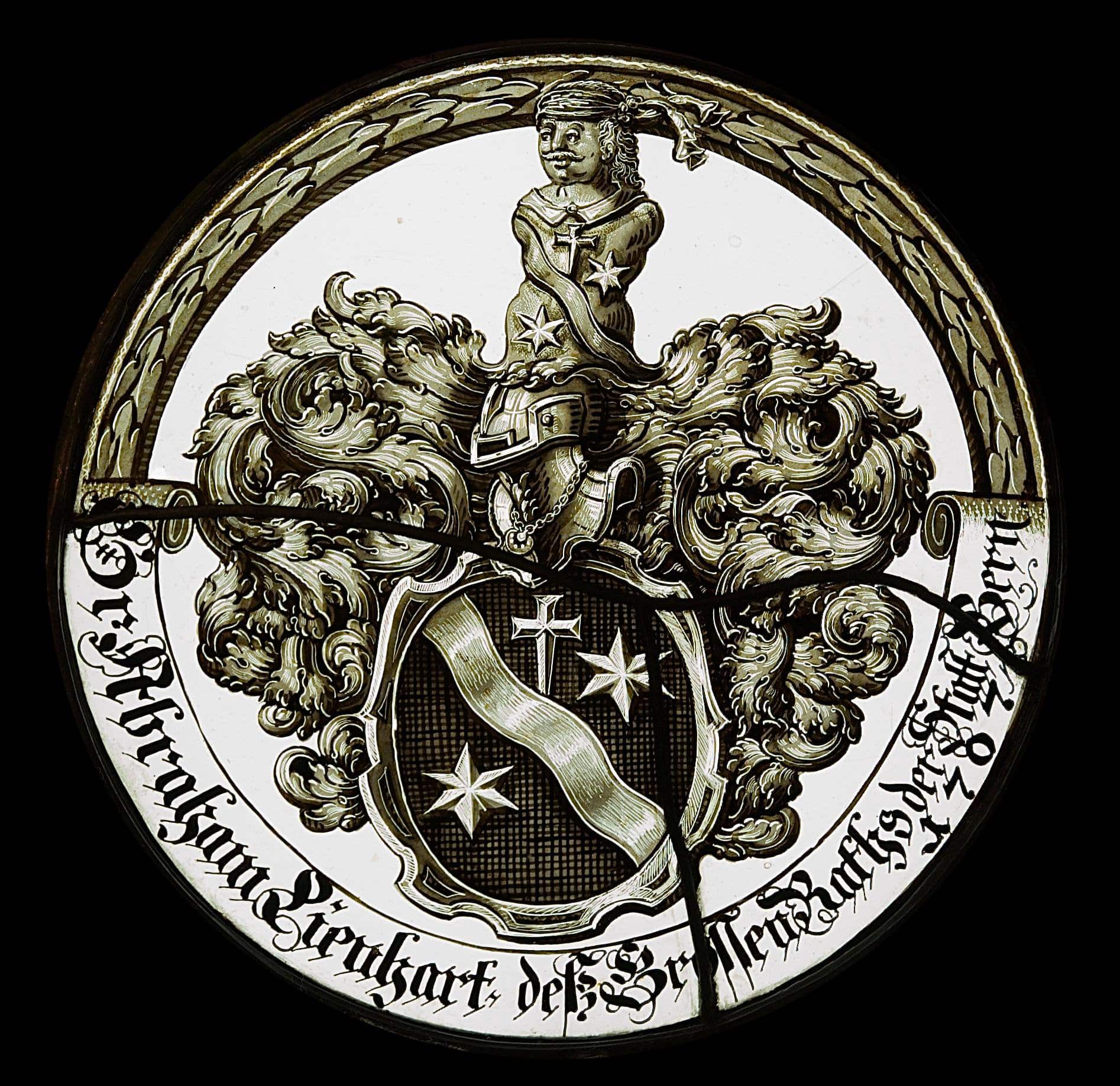 Die sehr regelmässige Kalligraphie mit den Haken an den unteren Buchstabenenden verbinden beide Scheiben mit einzelnen, von Jakob Forrer signierten Grisaillescheiben, wie zum Beispiel mit der Rundscheibe Johann Rudolf Lerbers von 1712 im Schweizerischen Nationalmuseum in Zürich (Inv. LM 6239; Schneider 1971, Bd. 2, Nr. 754) oder mit der ovalen Wappenscheibe Elisabeth von Diesbachs aus der Zeit nach 1702 in Freiburger Privatbesitz (Bergmann 2014, Bd. 2, Kat.-Nr. 407). Auch stilistisch und technisch sind all diese Scheiben eng verwandt, so dass sich auch für die vorliegende die Zuschreibung an den in Köniz arbeitenden Glasmaler Jakob Forrer aufdrängt.
