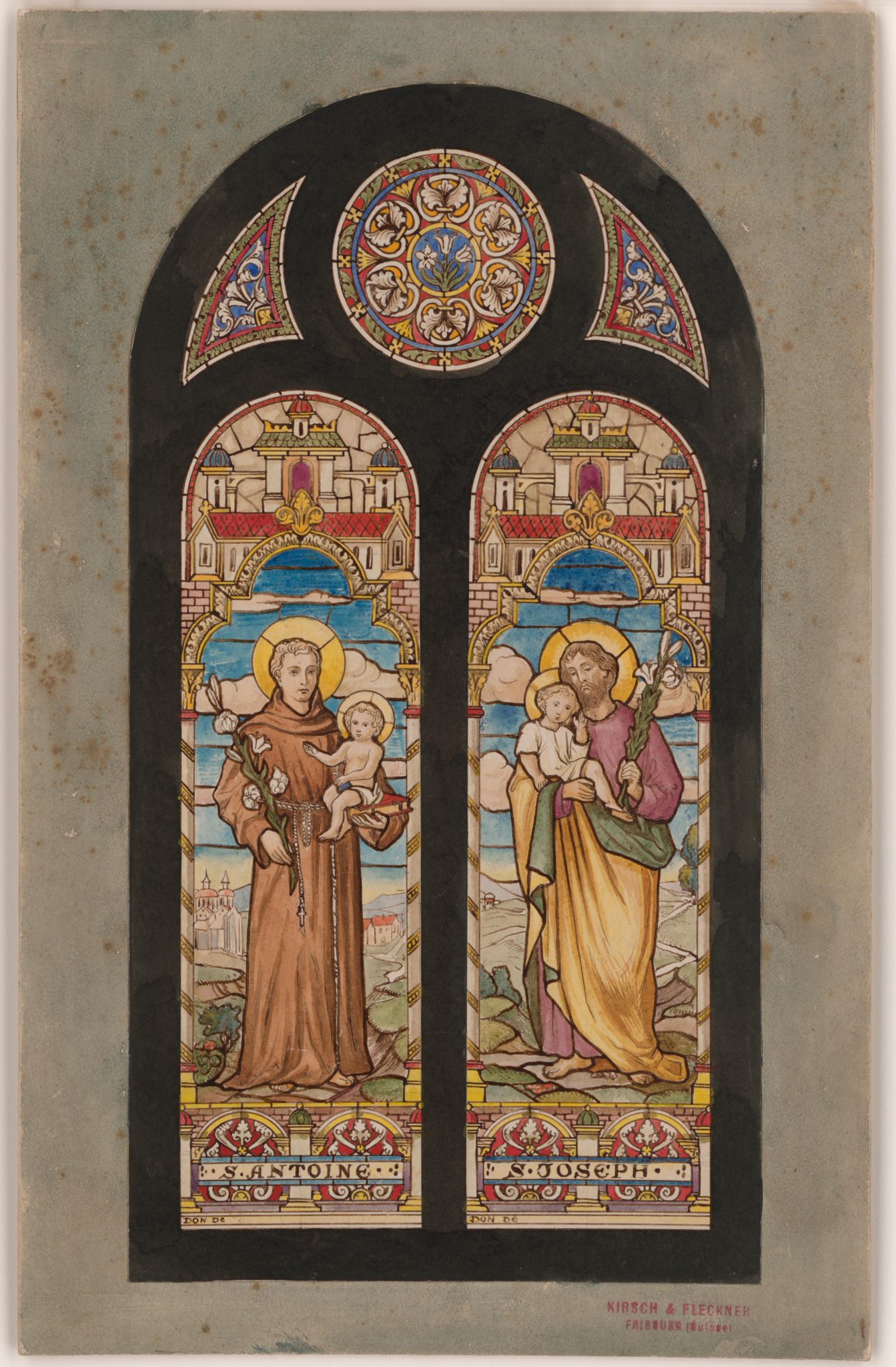 Sur la lancette de gauche, saint Antoine, debout et vêtu de la bure franciscaine, tient un lys de sa main droite et un livre sur lequel est assis le Christ de sa main gauche. A l’arrière-plan, une église à gauche du saint et quelques maisons à droite.