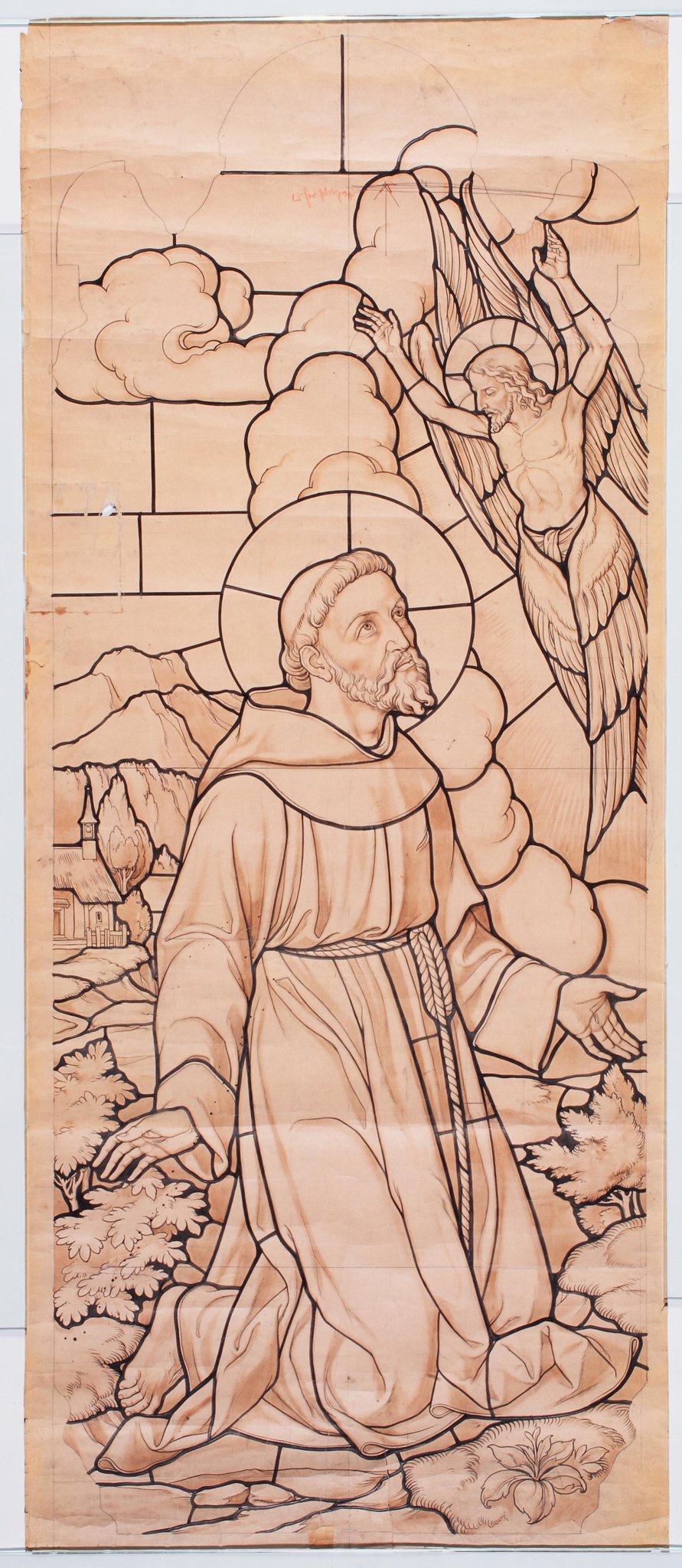 Ce carton, en noir et blanc, est le modèle précis à l’échelle 1:1 de la partie figurée du vitrail consacré à saint François d’Assise pour la première fenêtre à gauche dans la nef de l’église Saint-André à Onnens. Toute la partie décorative manque mais la forme de l’ouverture est indiquée avec précision. Dans le vitrail, cette scène narrative est inscrite dans un encadrement architectural.