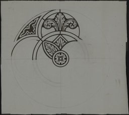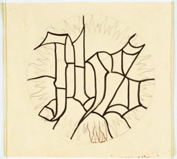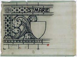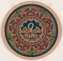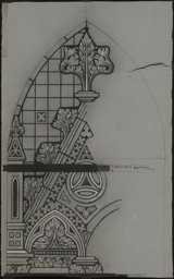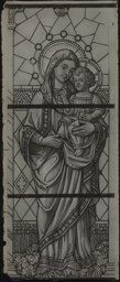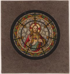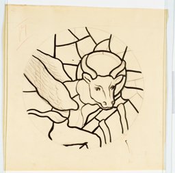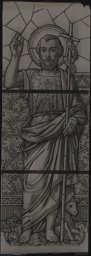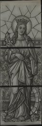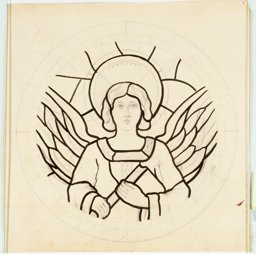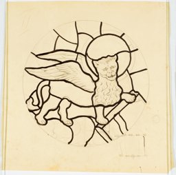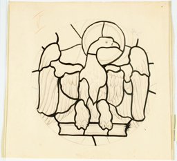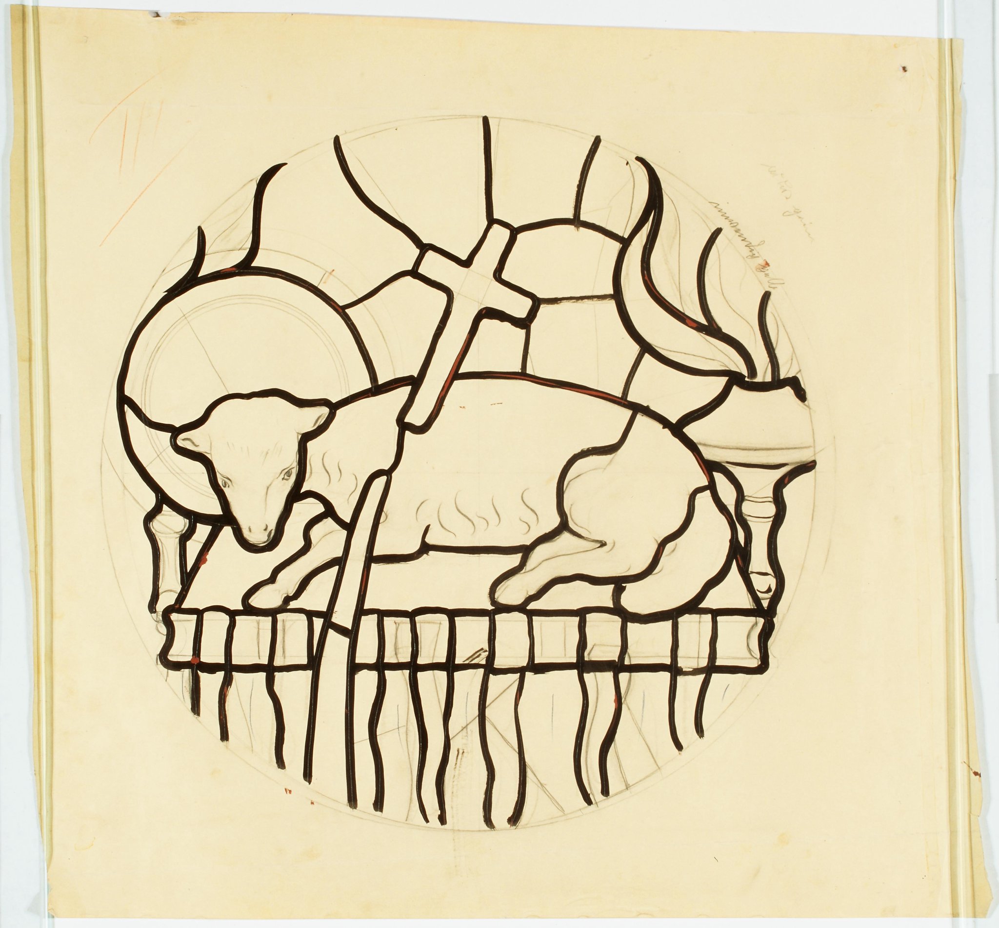 Ce carton en noir et blanc est le modèle précis à l’échelle 1:1 du médaillon au sommet de la troisième fenêtre à double lancette située dans le nef à gauche de l’église Saint-Jean-Baptiste à Grolley. Bien que l’ensemble des cartons illustrant les médaillons pour les vitraux de la nef ne soient pas signés, nous pouvons dire qu’ils sont très certainement de la main de l’artiste Raymond Buchs.