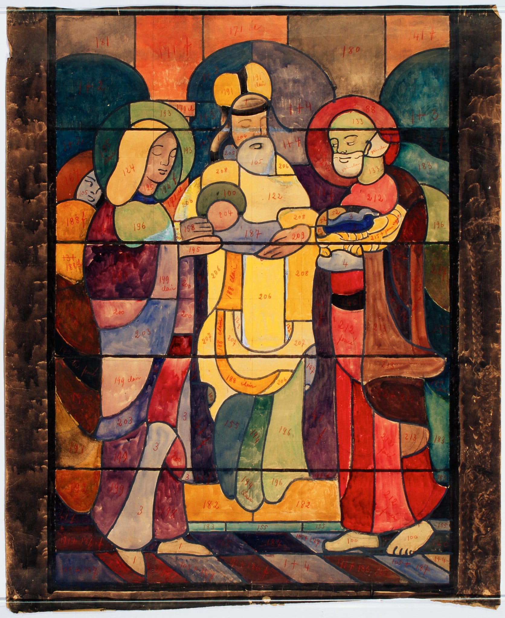 Ce carton en couleur est le modèle précis à l’échelle 1:1 de la partie inférieure du vitrail consacré au Baptême du Christ, Christ en discussion avec les docteurs et la Présentation du Christ au temple pour la deuxième fenêtre à gauche dans la nef de la chapelle Notre-Dame de la Paix à l’église Sainte-Thérèse dans le quartier de Champel à Genève.
