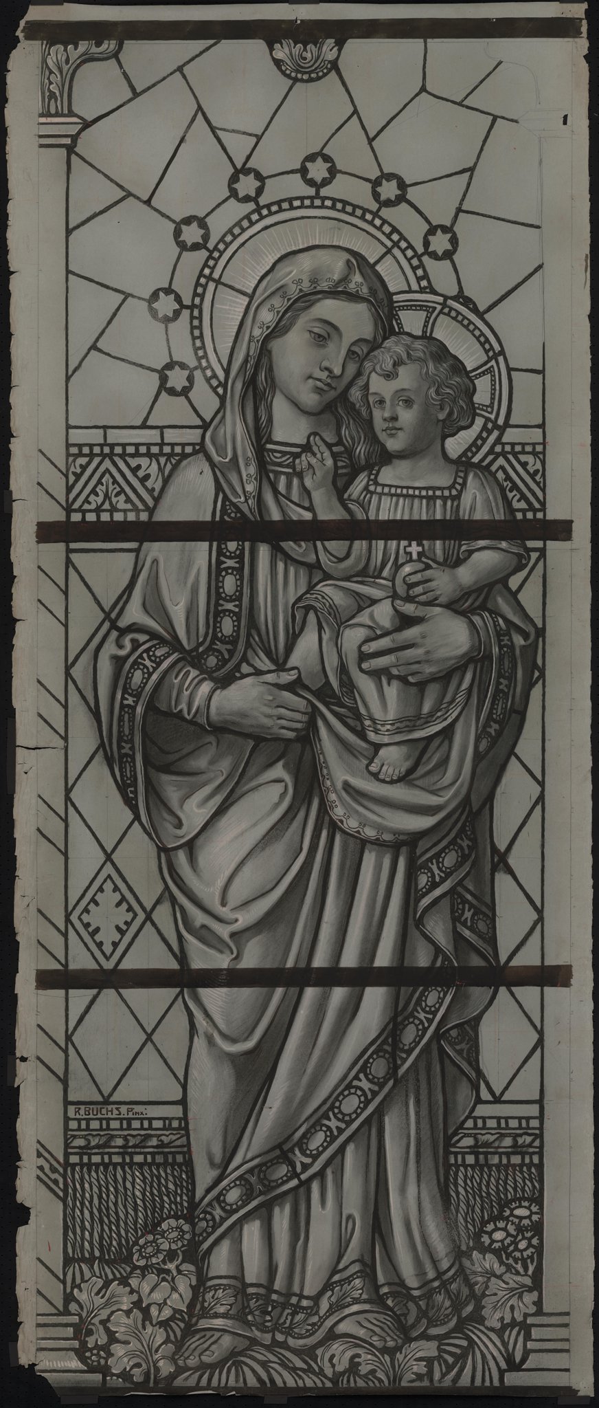 Ce carton en noir et blanc est le modèle précis à l’échelle 1:1 de la partie figurée de gauche du vitrail consacré à la Vierge Marie et à saint Joseph situé à gauche dans le choeur de l’église Saint-Jean-Baptiste à Grolley. Sur le vitrail, la Vierge à l’Enfant est inscrite dans un encadrement architectural qui fait l’objet de deux cartons séparés : le KF_824 pour la partie supérieure et le KF_834 pour la partie inférieure.
