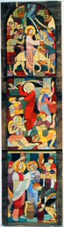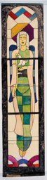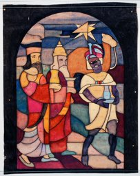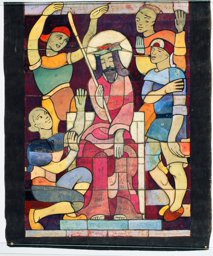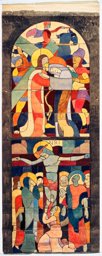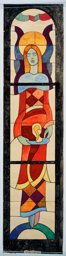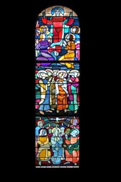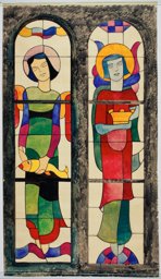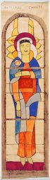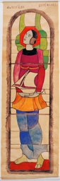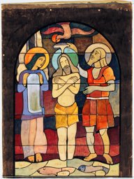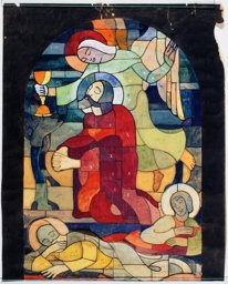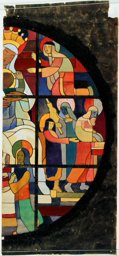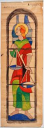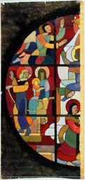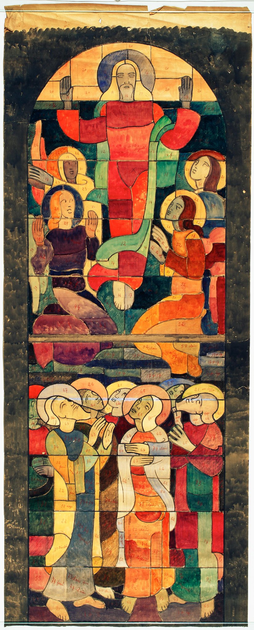 Ce carton en couleur est le modèle précis à l’échelle 1:1 de la partie supérieure du vitrail consacré à l’Ascension et à la Pentecôte pour la première fenêtre à droite dans la nef de la chapelle Notre-Dame de la Paix à l’église Sainte-Thérèse dans le quartier de Champel à Genève.