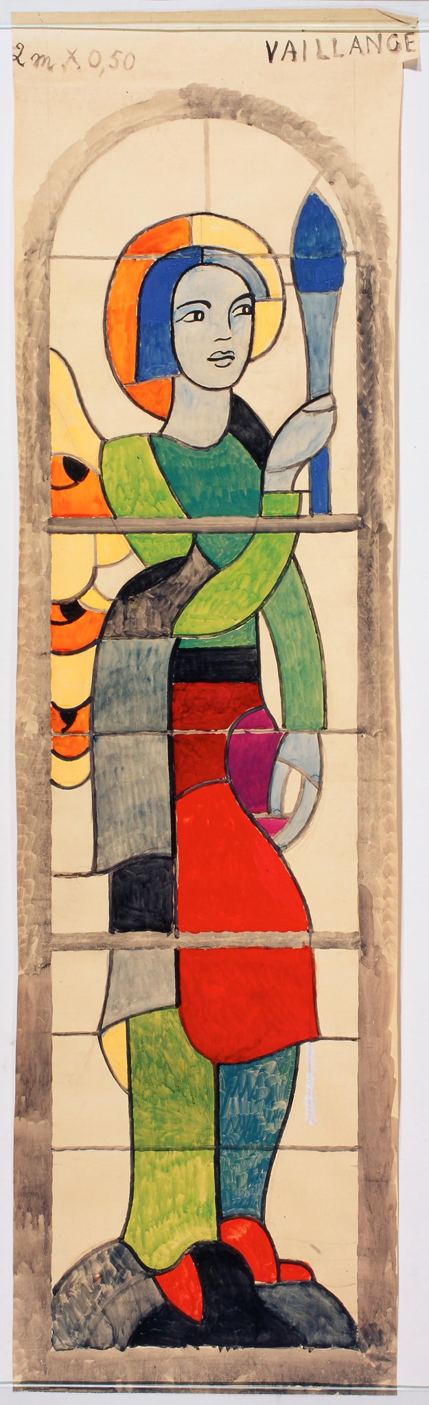 Ce carton en couleur est le modèle à l’échelle 1:1 d’un vitrail consacré à la Vaillance qui pourrait avoir été imaginé pour pour l’une des fenêtres hautes de la nef de l’église Sainte-Thérèse dans le quartier de Champel à Genève selon les indications écrites sur un bout de carton déchiré (aujourd’hui disparu mais mentionné dans l’inventaire par Augustin Pasquier) accompagnant un rouleau de cartons pour Sainte-Thérèse. Les dimensions mentionnées sur ce carton semblent concorder avec la taille de l’ouverture des fenêtres hautes de la nef. En date du 3 janvier 1949, Castella envoie au curé Carlier de la paroisse Sainte-Thérèse de Genève quelques cartons pour ces hauts-jours (voir inscription au verso du KF_1028). Nous ne connaissons pas les raisons pour lesquelles ce projet n’a pas abouti mais une des plus probables est que Castella quitte la Suisse pour retourner en Australie au cours de cette année 1949. Finalement ces hauts-jours n’ont pas été parés de vitraux.