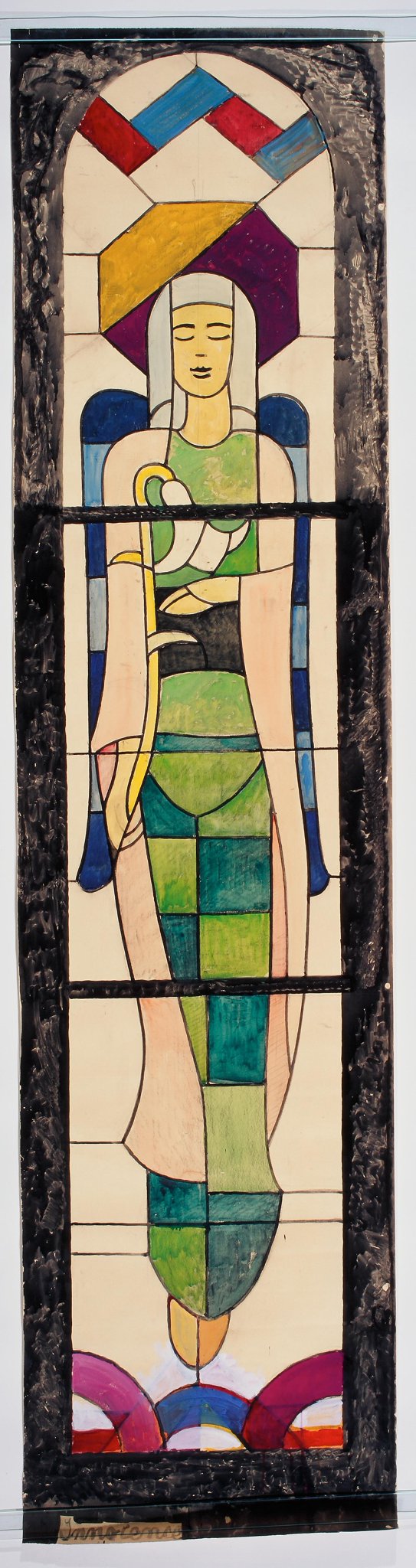 Ce carton en couleur est le modèle à l’échelle 1:1 d’un vitrail consacré à l’Innocence qui pourrait avoir été imaginé pour l’une des fenêtres hautes de la nef de l’église Sainte-Thérèse dans le quartier de Champel à Genève selon les indications écrites sur un bout de carton déchiré (aujourd’hui disparu mais mentionné dans l’inventaire par Augustin Pasquier) accompagnant un rouleau de cartons pour Sainte-Thérèse. Les dimensions mentionnées sur ce carton semblent concorder avec la taille de l’ouverture des fenêtres hautes de la nef. En date du 3 janvier 1949, Castella envoie au curé Carlier de la paroisse Sainte-Thérèse de Genève quelques cartons pour ces hauts-jours (voir inscription au verso du KF_1028). Nous ne connaissons pas les raisons pour lesquelles ce projet n’a pas abouti mais une des plus probables est que Castella quitte la Suisse pour retourner en Australie au cours de cette année 1949. Finalement ces hauts-jours n’ont pas été parés de vitraux.