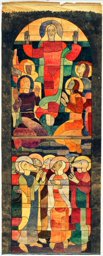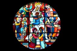 Ce carton en couleur est le modèle précis à l’échelle 1:1 de la partie droite de la rose consacrée à la Vierge à l’Enfant pour l’ouverture au-dessus de l’autel dans le choeur de la chapelle de la Paix à l’église Sainte-Thérèse dans le quartier de Champel à Genève.