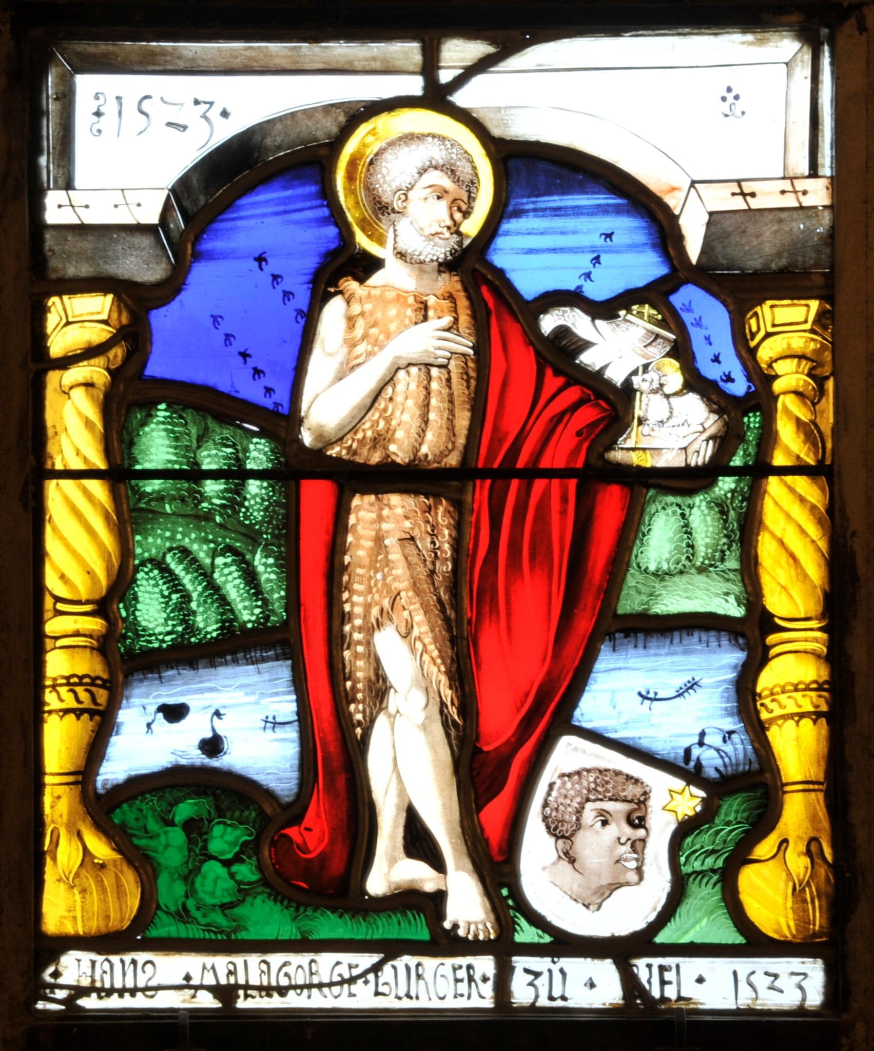 Im Vordergrund einer bewaldeten Flusslandschaft steht Johannes der Täufer in rotem Mantel und Fellkleid. Auf dem Buch in seiner Linken sitzt das Gotteslamm mit der Kreuzfahne und zu seinen Füssen befindet sich der Schild mit dem Wappen von Hans Malagorge. Als Rahmung dient eine Arkade aus gelben Balustersäulen und einem hellgrauen Flachbogen mit der Jahreszahl 1523 oben links.