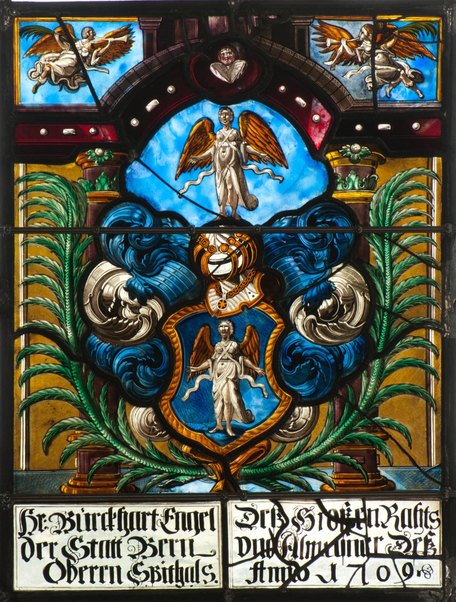 Hr: Burckhart Engel Deß [Gr]oße[n Rahts] / der Statt Bern vnd [Alm]usn[er Deß] / Oberen Spithals. Anno 1[70]9 (in Klammern die ergänzten Teile).