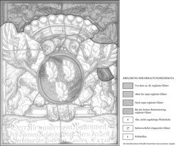 Zwei Gläser im rechten Greifen (Kopf, Hinterteil) sowie die Gläser am oberen Rand mit den beiden Engeln neu ergänzt (das Foto des SNM Zürich zeigt oben rechts Flickstücke an Stelle der heutigen Ergänzungen und weniger Sprungbleie); ein Sprung und mehrere Sprungbleie; die Verbleiung erneuert.