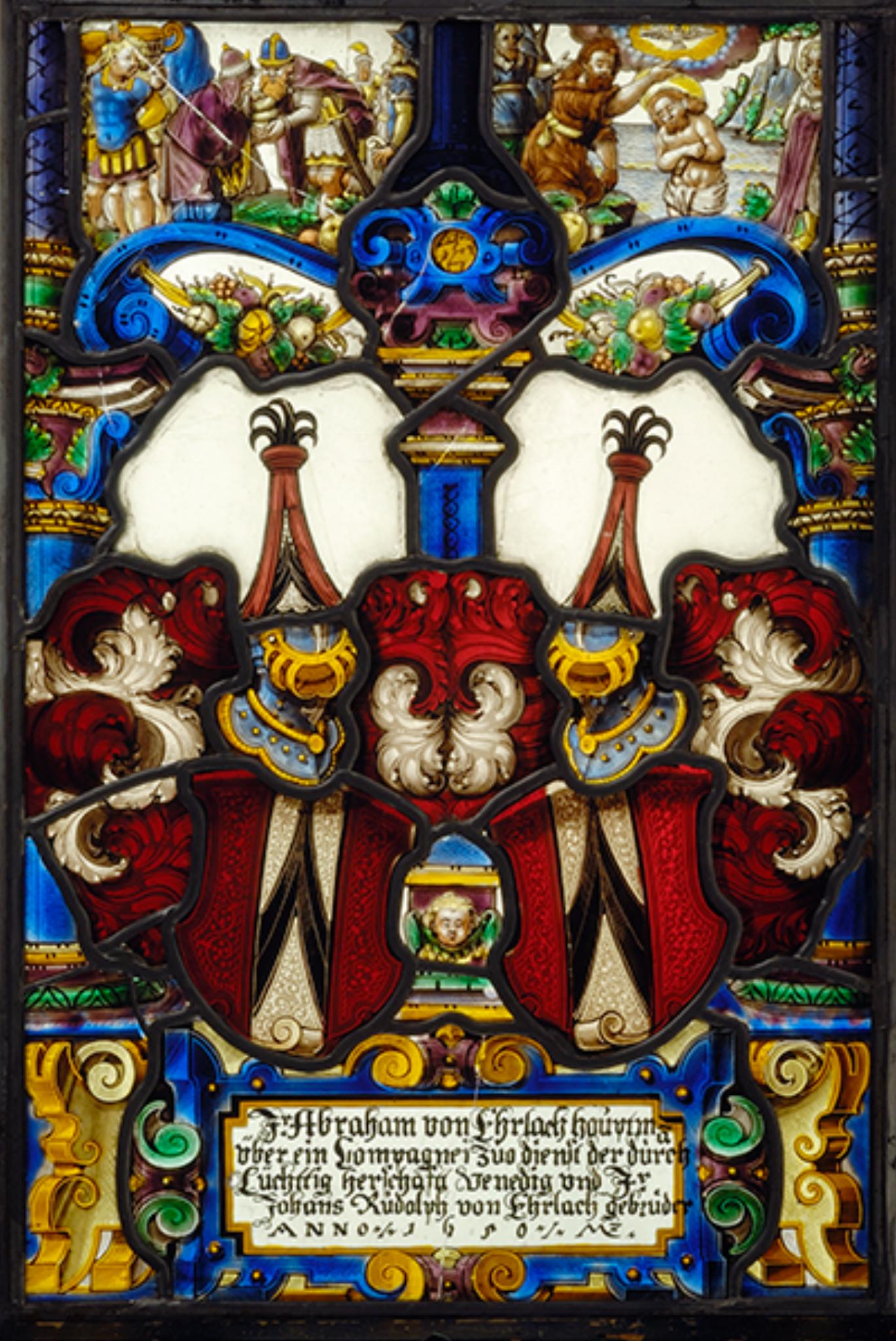 Die Wappenscheibe der Gebrüder Erlach gehört zu den qualitätvollen und reich mit Schmelzfarben bemalten, farbenfrohen Werken Matthias Zwirns, die dieser Berner Glasmaler stolz mit seinem Monogramm signierte.