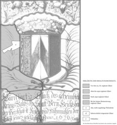 Zwei an ihren unteren Enden mit einer blauen Schleife zusammengebundene Palmblätter rahmen das vor gelben Grund gesetzte und von einer Freiherrenkrone bekrönte Wappen des Burkhart von Erlach. Darüber zieht sich im geschweiften Oberbild ein Frucht- und Blütenkranz hin. Am Fuss steht die Burkhart von Erlach gewidmete Inschrift.