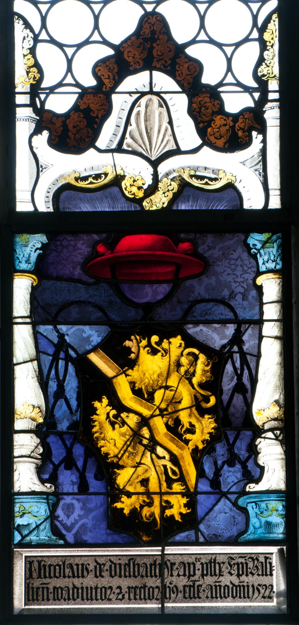 Vor violettem Damastgrund ist der Rossstirnschild mit dem Wappen des Nikolaus III. von Diesbach auf das erneuerte Podium mit der Stifterinschrift gesetzt. Darüber befindet sich der quastenbehängte rote Protonotariushut (Prälatenhut). Seitlich wird der Wappenschild von steinfarbenen Renaissance-Säulen mit hellblauen Basen und Kapitellen gerahmt. Die Renaissance-Bekrönung im oberen Fensterfeld ist eine moderne Kopie.