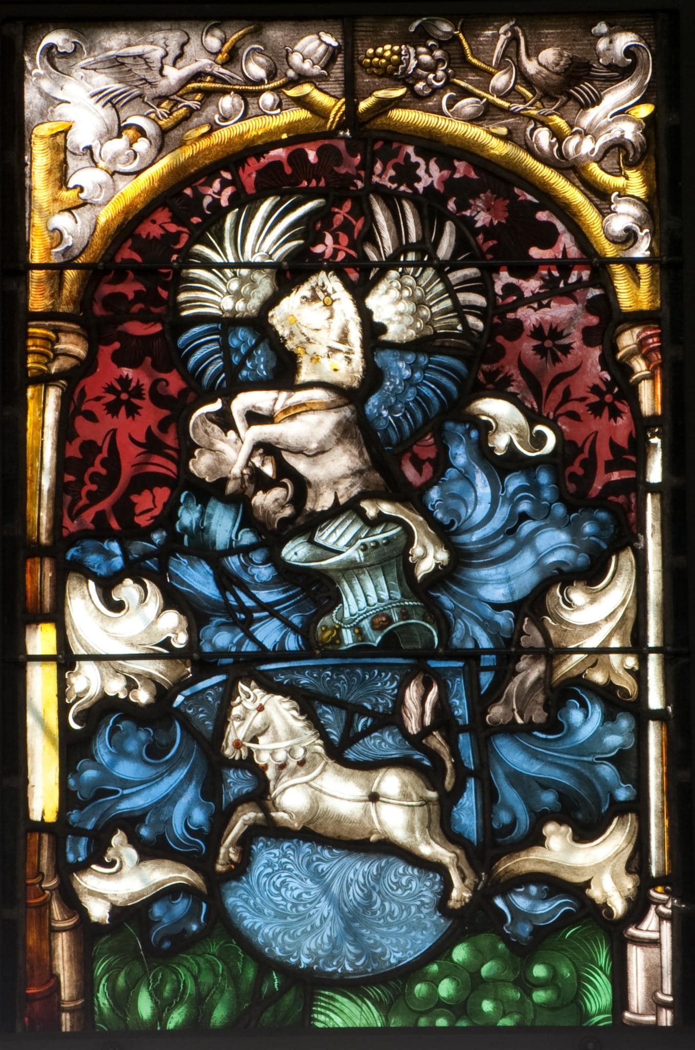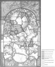 Vermutlich einige alte Ergänzungen in beiden Säulchen; der ganze obere Bogen, Stücke in der Helmzier, der Helmdecke und im Wappen sowie das Eckstück unten rechts neu ergänzt; alte Flickstücke in beiden Säulen; wenige kleinere Sprünge und mehrere Sprungbleie; die Verbleiung erneuert.