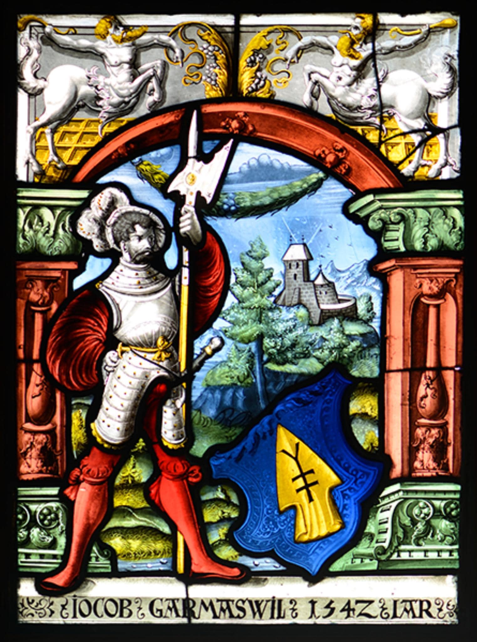 Das auf den beschrifteten Sockel gesetzte Wappen des Jakob Garmiswil erscheint in Begleitung des graubärtigen, rote Kleidung, ein weisses Federbarett und einen stahlblauen Halbharnisch tragenden Stifters. Dieser hat Schwert und Schweizerdolch am Gürtel festgemacht und hält in seiner Linken eine Halbarte. Hinter ihm ist eine Gebirgslandschaft mit einer auf einem Hügel stehenden Burg dargestellt. Figur und Wappen rahmen seitlich hellrote Pfeiler mit vorgesetzten Balustersäulchen sowie hellgrünen Basen und Kapitellen. Über dem darauf fussenden hellroten Flachbogen duellieren sich zwei Kentauren mit Keulen.