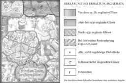 Vor farblosem Grund erscheint das Vollwappen von Abraham Zeender in Begleitung der antik gerüsteten allegorischen Gestalt der Stärke, die in ihren Händen einen Säulenstumpf und ein Kapitell hält. Der Stiftername befindet sich unterhalb von Wappen und Figur in einer grünen Rollwerkartusche, die von zwei auf Glocken und Geschützrohren sitzenden Putten flankiert wird. Das Oberbild zeigt eine von einem Kanonier belagerte Stadt am Fluss. Auf der Glocke des Zehnder-Wappens ist die Wappenpyramide Bern-Reich angebracht.