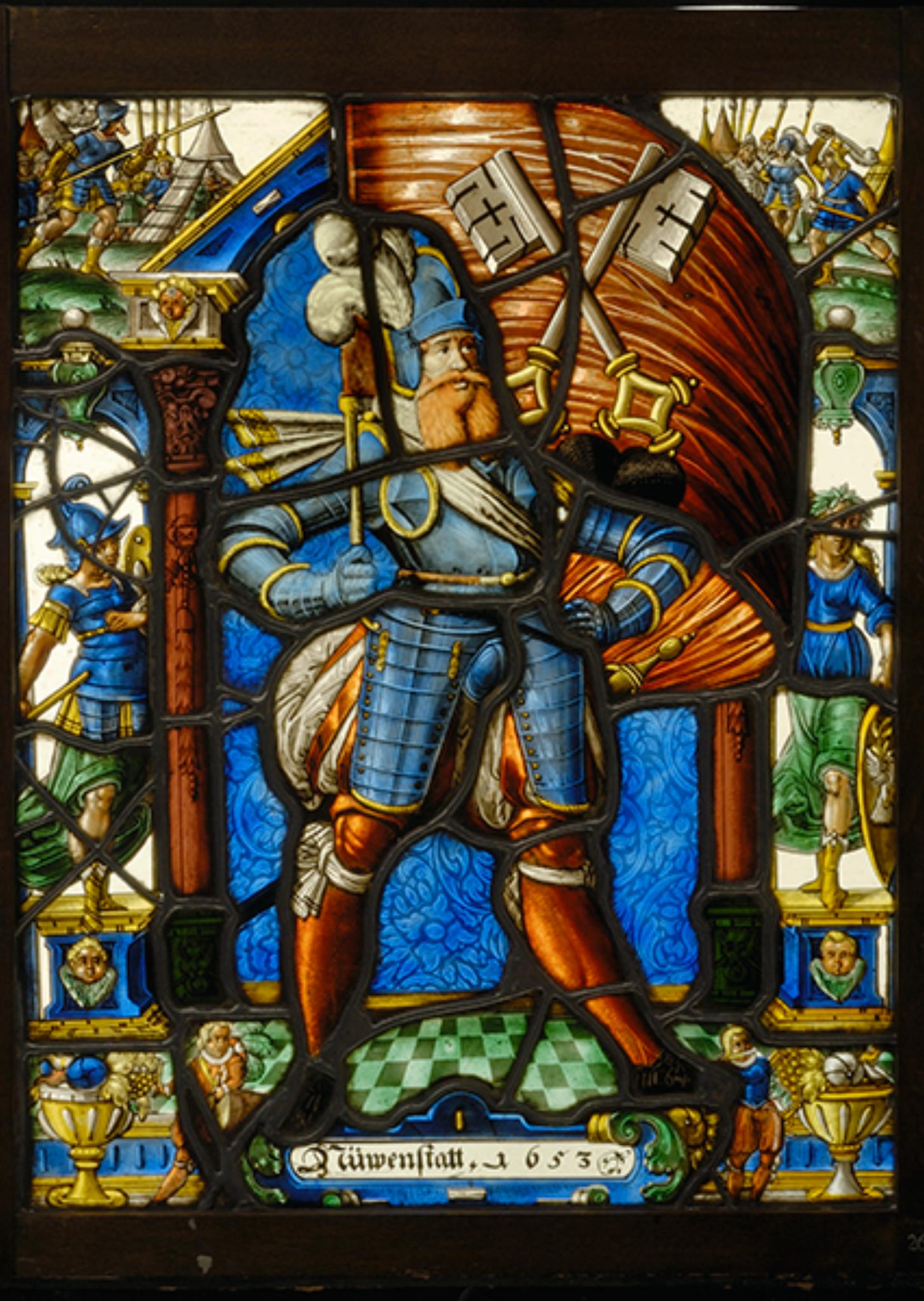 Der bärtige Bannerträger von Neuenstadt ist über die blaue Rollwerkkartusche mit dem Stifternamen gesetzt. Das sich schwungvoll ausbreitende Banner in seiner angewinkelten Rechten haltend, erscheint er in stahlblauem Halbharnisch, geschlitzten weinroten Pluderhosen mit weissem Innenstoff und weinroten Strümpfen. Hinter ihm erhebt sich vor blauem Damast und über grün und grau gefliestem Boden eine Arkade aus weinroten Säulen und einem blauen Giebel. Daran schliesst sich seitlich je eine schmale Bogenöffnung. Darin stehen vor farblosem Grund zwei weibliche allegorische Gestalten auf blauen, mit einem geflügelten Engelskopf geschmückten Postamenten. Darunter befindet sich je eine Fruchtschale sowie ein mit Trommel bzw. Pfeife musizierender Knabe. Im Oberbild wird Davids Kampf gegen Goliath geschildert (1 Sam 17, 49f.).