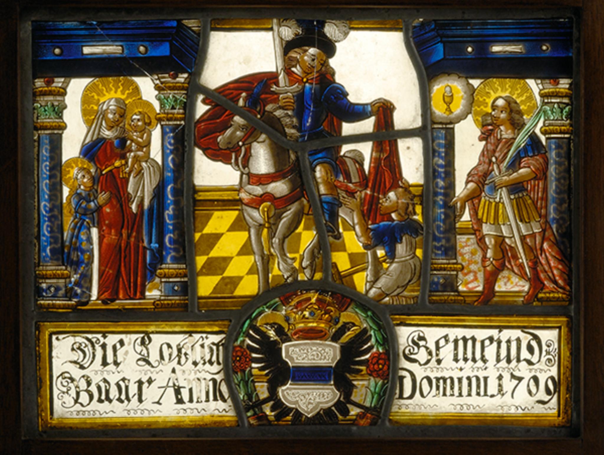 Im Zentrum reitet der hl. Martin zu Pferd in blauer Kleidung und rotem Mantel. Einen Teil seines mit dem Schwert zerteilten Mantels spendet er dem Bettler, der vor ihm auf dem gelb und braun gefliesten Boden niederkniet. In den seitlichen, von blau marmorierten Säulen gerahmten Architekturöffnungen erscheinen die Gemeindeheiligen von Baar, links die hl. Anna Selbdritt und rechts der hl. Silvanus. Die hl. Anna ist in ein langes rotes Kleid, einen blauen Mantel und einen weissen Kopfumhang gehüllt. Während sich die blaugewandete, kindlich kleine Maria an ihre Hüfte schmiegt, sitzt das Christkind im linken Arm seiner Grossmutter. Der Katakombenheilige Silvanus trägt eine antikische Rüstung mit blauem Brustpanzer, gelbem Waffenrock und rot-braun damasziertem Umhang. In seiner Linken Schwert und Palmzweig haltend, blickt er auf das Allerheiligste, das ihm in einem Kelch vor einer umwölkten Gloriole erscheint. Der Stifterinschrift am Standsockel ist im Zentrum ein ovaler Lorbeerkranz aufgesetzt. Dieser umfasst den von der Reichskrone bekrönten und vom Doppeladler des Reichs umfangenen Zuger Wappenschild.