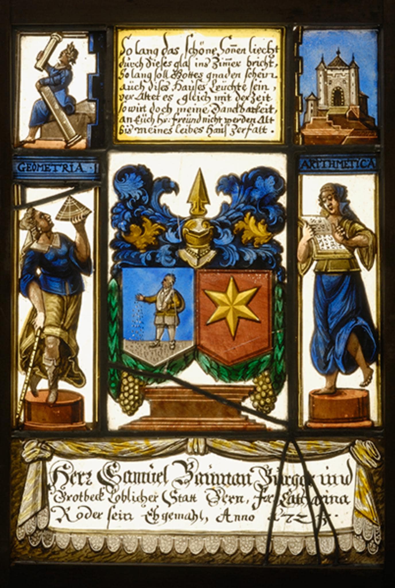 So lang das schöne Sonen liecht / durch dieses glas ins Zimer bricht, / So lang soll Gottes gnaden schein / aüch dises Hauses Leüchte sein, / ver Altet es gleich mit der Zeit / so wirt doch meine Danckbarkeit, / an Eüch hr: freünd nicht werden Alt / bis meines Leibes Haus Zerfalt.