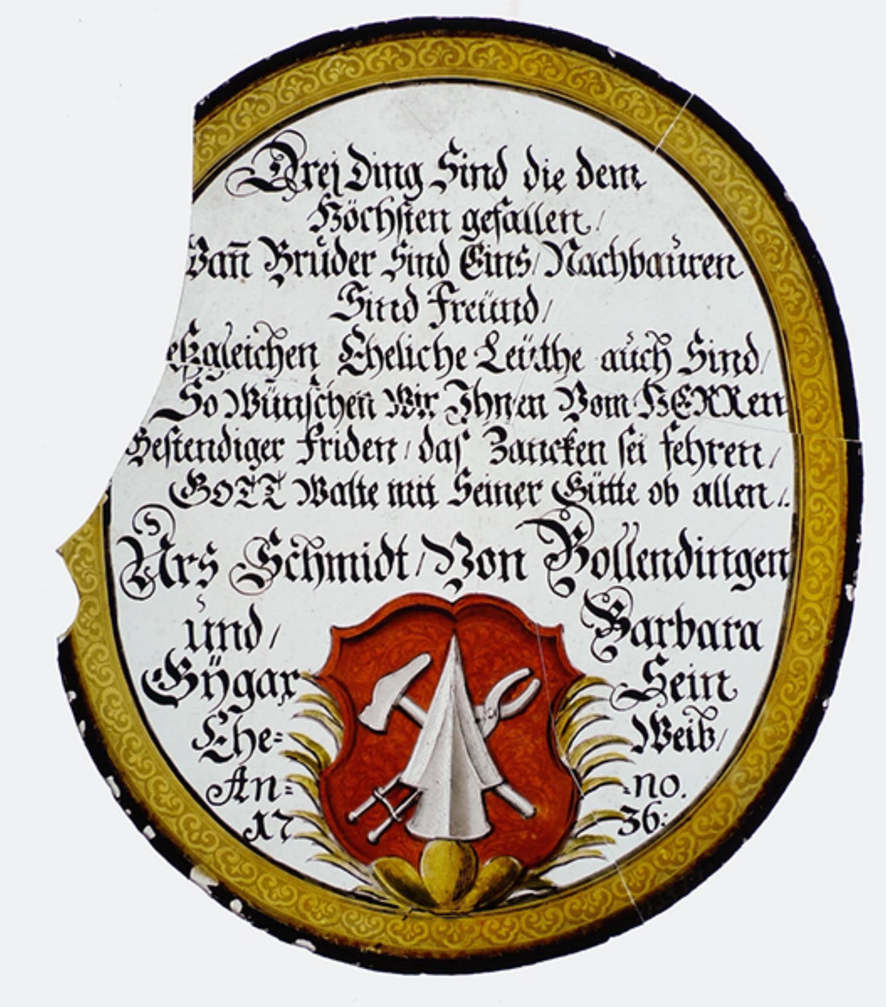 Der von Palmblättern eingefasste Wappenschild von Urs Schmidt (Schmid) ist vor farblosem Grund an den unteren Rand der Ovalscheibe gesetzt. Darüber befinden sich die Stifternamen sowie ein längerer erbaulicher Spruch. Wappen und Text rahmt eine ornamentale gelbe Bordüre.