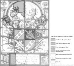 Die Scheibe zeigt vor blauem Grund den gevierten Schild mit den Vollwappen von Vinzenz Maximilian Thellung und dessen Gemahlin Salome von Diesbach. In zwei grüne Palmwedel gesetzt, erhebt sich dieser auf dem Podium, an dessen Front die Tafel mit den Stifternamen steht. Die Rahmung bilden schlanke, von einem gelben Rundbogen überspannte Säulchen. Die oberen Zwickelfelder sind mit Blumenbouquets dekoriert.