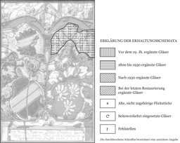 Vor blau gefiedertem Damastgrund nehmen die Vollwappen von Johann Anton III. Tillier und Katharina von Wattenwyl die ganze Scheibenbreite ein. Sie stehen auf dem Podium mit der Stifterinschrift vor einer Doppelarkade aus gelb bzw. rosa marmorierten Pfeilern und roten Spitzbogen. Das zweigeteilte Oberbild schildert die Himmelfahrt Christi (links) und das Gleichnis vom Pharisäer und Zöllner (rechts).