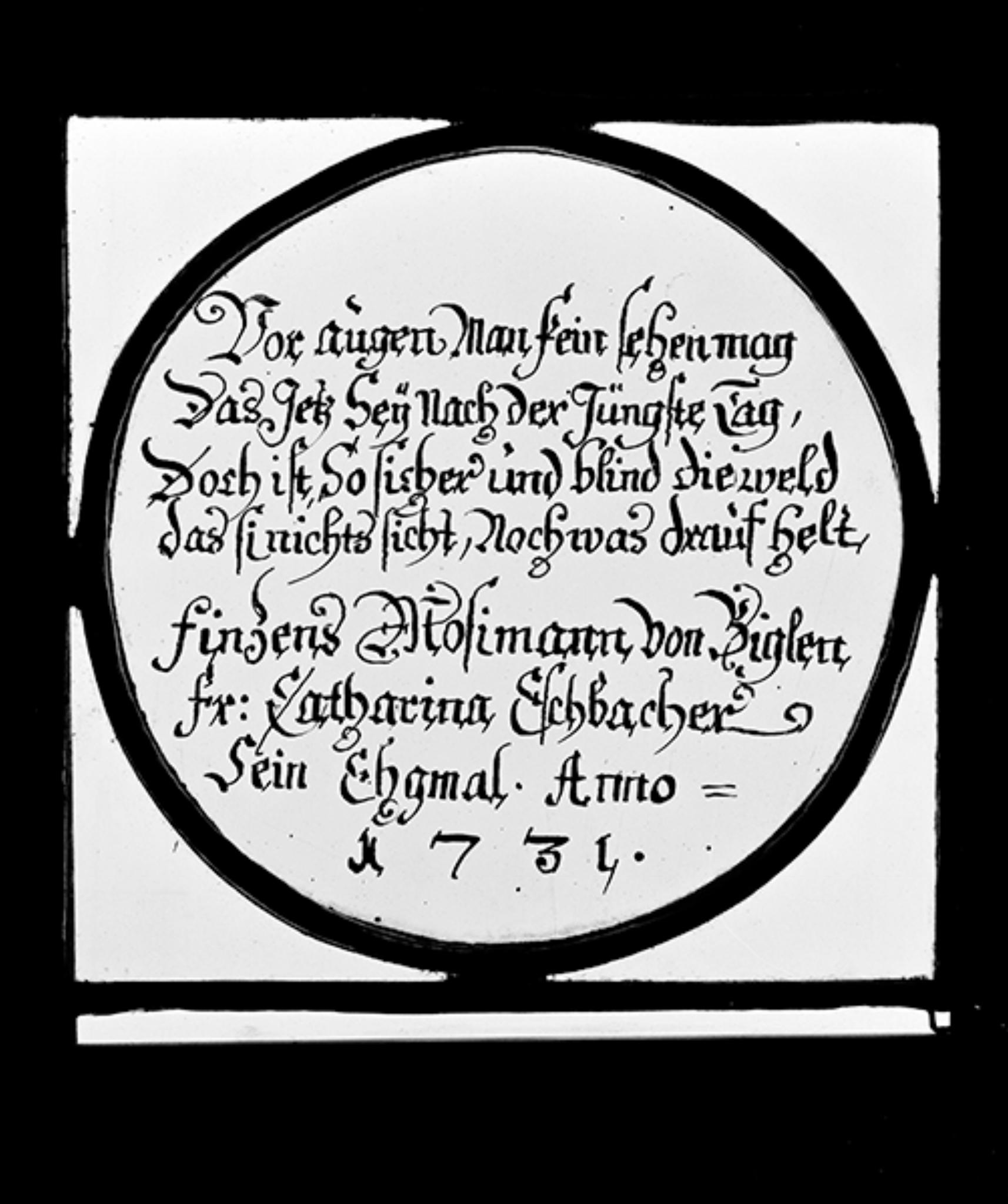 Der Spruch der vorliegenden Scheibe geht auf Joachim von Beusts "Christiados Libellus" (Erstausgabe 1570) zurück. Diese dem religiösen Unterricht dienende Verssammlung fasst das Evangelium in mehrsprachigen Versen zusammen und ordnet sie den Sonntagen des Jahres zu. Dem 2. Advent ist folgender Spruch, auf dem Lukasevangelium, Kap. 21, basierend, zugeordnet: "Fur Augen man frey sehen mag / Das jtzt nah sey der Jüngste tag: / Doch ist so sicher blind die Welt / Das sies nicht sicht / und nichts drauff helt." (Ausgabe 1574, S. 189).