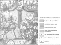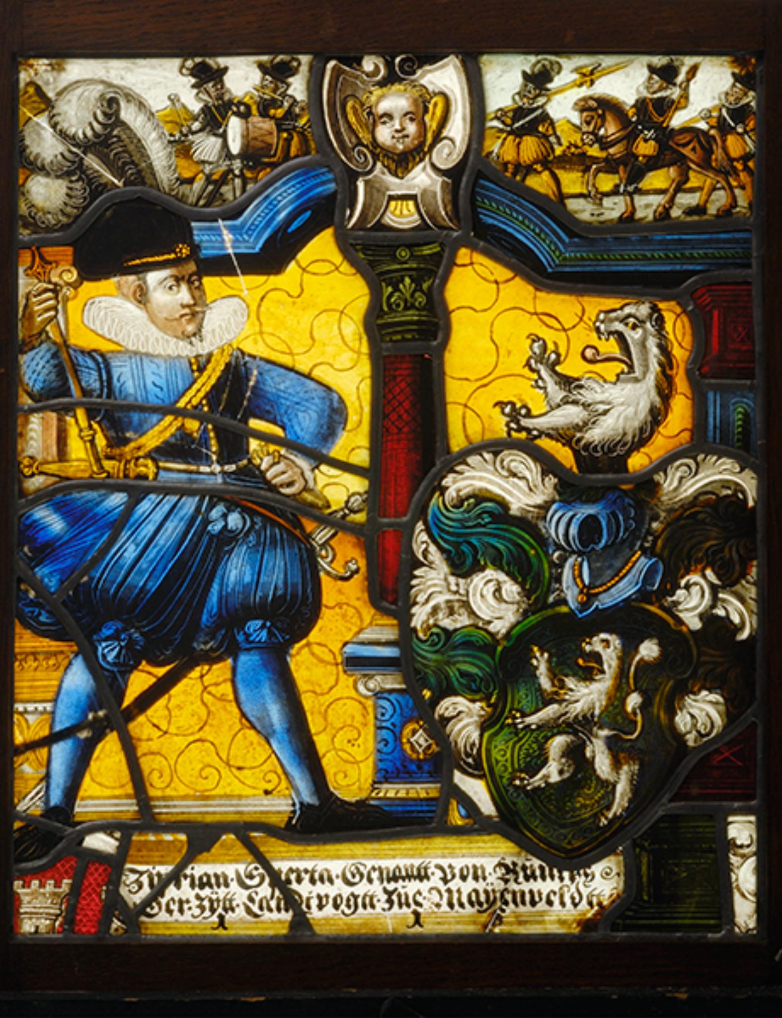 Vor gelbem, schnurverziertem Grund steht der Stifter in blauer Kleidung und mit einem Federhut bedeckt neben seinem Vollwappen. Er ist mit Schwert und Schweizerdolch bewaffnet und hält in seiner Rechten einen Kommandostab. Hinter ihm erheben sich zwei Rahmenpfeiler und eine rote Mittelsäule als Träger eines eingezogenen blauen Flachbogens. Das Oberbild zeigt den Stifter hoch zu Ross beim Aufzug als Landvogt in Begleitung zweier Halbartiere sowie eines Trommlers und Pfeifers. Das Podium mit der Stifterinschrift am Scheibenfuss ist z. T. mit alten Flickstücken durchsetzt.