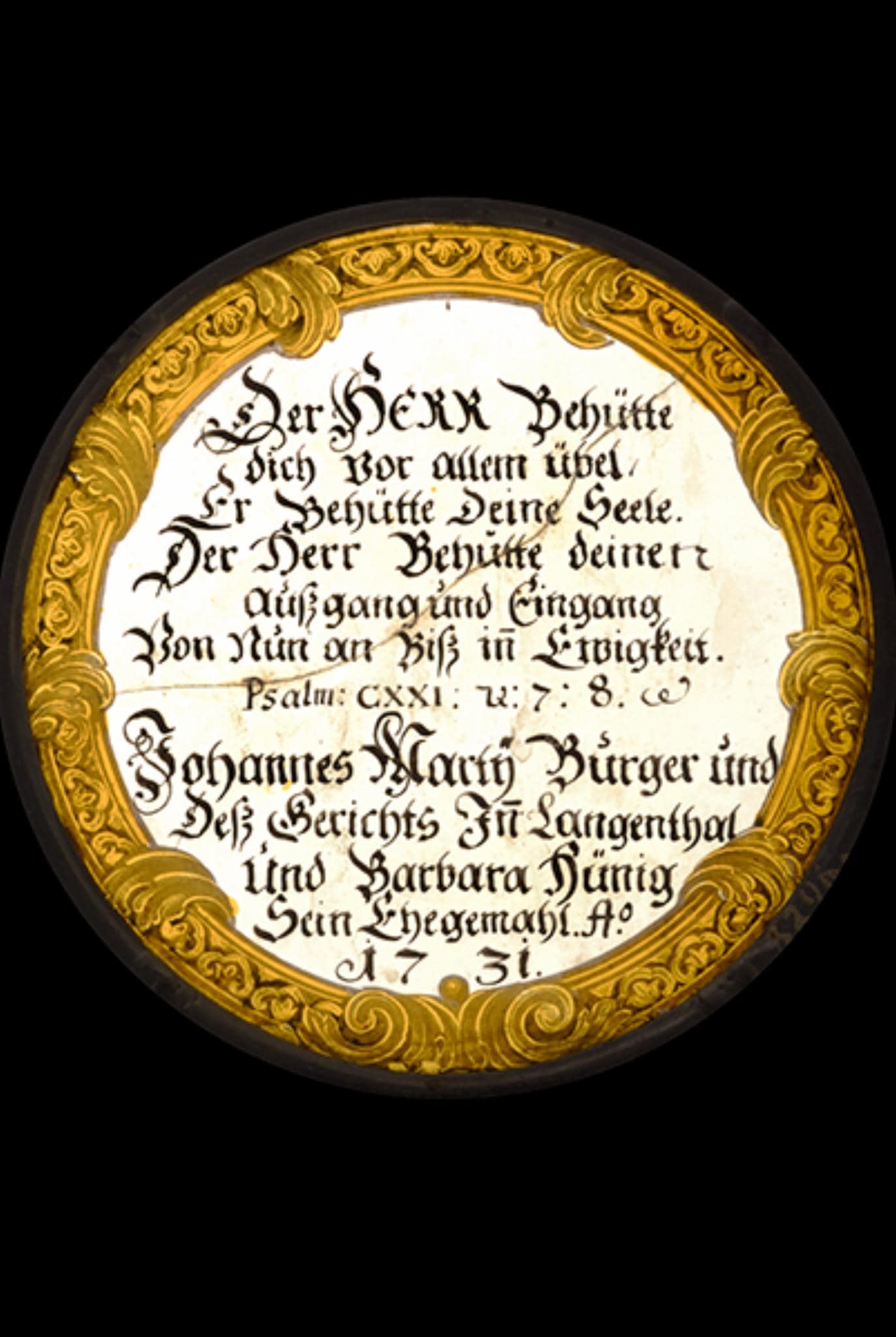 Der HERR Behütte / dich vor allem Übel / Er Behütte Deine Seele. / Der Herr Behütte deinen / Auβgang und Eingang / Von Nun an Biβ in Ewigkeit. / Psalm: CXXI : V: 7 : 8. // Johannes Martÿ Burger und / Deβ Gerichts Jn Langenthal / Und Barbara Hünig / Sein Ehegemahl. Ao. / 17 31.