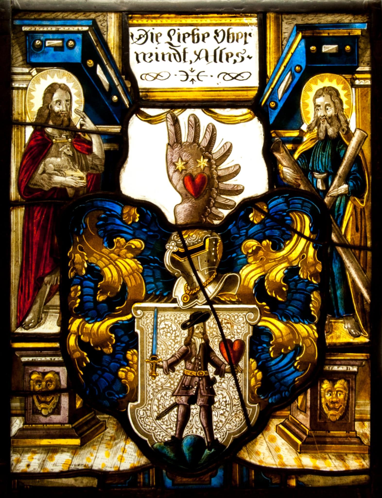 Die Wappenscheibe lässt sich dem aus Sursee gebürtigen Glasmaler Leontius Bucher (1653–ca. 1714) zuweisen, der sich spätestens ab 1679 in Freiburg i. Ü. aufhielt und dort bis zu seinem Lebensende wohnhaft blieb. Das Schweizerische Nationalmuseum in Zürich ist im Besitz einer analog komponierten, die Apostel Petrus und Jakobus als Schildbegleiter darstellenden Wappenscheibe mit dem Monogramm Buchers, die dieser 1696 für den Landschreiber von La Roche Jakob Bapst ausführte (Inv. LM 47024, 30,5 x 19 cm; Jahresbericht SNM Zürich 1971, S. 61, 75, Abb. 90; Bergmann 2014, Bd. 1, S. 238, Abb. 160). Die vorliegende Scheibe, deren Unterteil mit der Inschriftentafel verloren ist, wurde von Bucher sicher ebenfalls 1696 geschaffen, und zwar für denselben Ort wie das Geschwisterstück mit dem Wappen Jakob Bapsts. Ihr unbekannter Stifter dürfte demnach in derselben Gegend wie Bapst ansässig gewesen sein, das heisst vermutlich in der Region von Bulle im Greyerzerland (Kanton Freiburg). Anhand des Herzens, das die Wappenfigur hält und anhand des auf die Liebe anspielenden Wahlspruchs über dem Wappenschild stellt sich die Frage, ob der Familienname des bislang nicht identifizierten Stifters "Liebi" gelautet haben könnte (die in Seftigen und Thun im Kanton Bern nachgewiesenen Familien Liebi besitzen allerdings andere Wappen und ob in den Freiburger Landen ein Geschlecht dieses Namens existierte, bleibt zu prüfen). Zu denken wäre allenfalls aber auch an die Familie Gaydamour (Guex d'Amour) aus Freiburg, deren Wappen bislang unbekannt ist (die bislang für die Familie in Anspruch genommene Scheibe mit der Inschrift Christian Gaydamours im Freiburger Museum für Kunst und Geschichte ist zusammengesetzt und liefert keine Hinweise auf deren Wappen; Bergmann 2014, Bd. 2, Kat.-Nr. 119).
