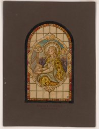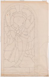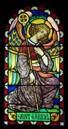 L’archange Gabriel, agenouillé et les mains jointes, tient un lys contre son bras gauche. Il baisse sa tête et ses yeux sont clos. Il porte un grand manteau orange sur une robe beige ornée de motifs ronds et d’une large bordure.