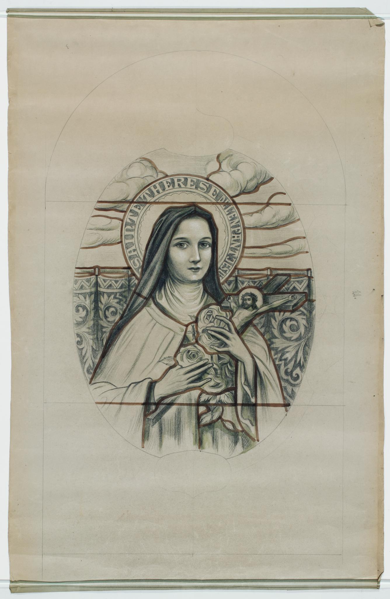 Ce carton en noir et blanc est un projet pour le vitrail de sainte Thérèse de Lisieux, situé dans la deuxième fenêtre à gauche dans la nef de la chapelle Notre-Dame-de-la-Brillaz à Prez-vers-Noréaz. Ce petit sanctuaire, lieu de pèlerinage local, est édifié en 1926-1927 par l’architecte fribourgeois Léon Hertling (Lauper, 2012, p. 240). Douze petits vitraux ornent l’ensemble des fenêtres. C’est l’artiste-architecte Jean Crivelli (les trois maquettes KF_122, KF_162 et KF_163 sont signées de ses initiales JC) et l’atelier fribourgeois Kirsch & Fleckner qui en sont les auteurs. Le cycle date de la construction du bâtiment en 1927 (le vitrail de sainte Cécile est signé et daté en bas à droite : KIRSCH et FLECKNER / FRIBOURG . 1927.).