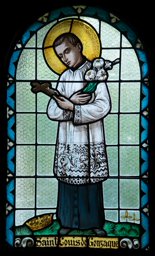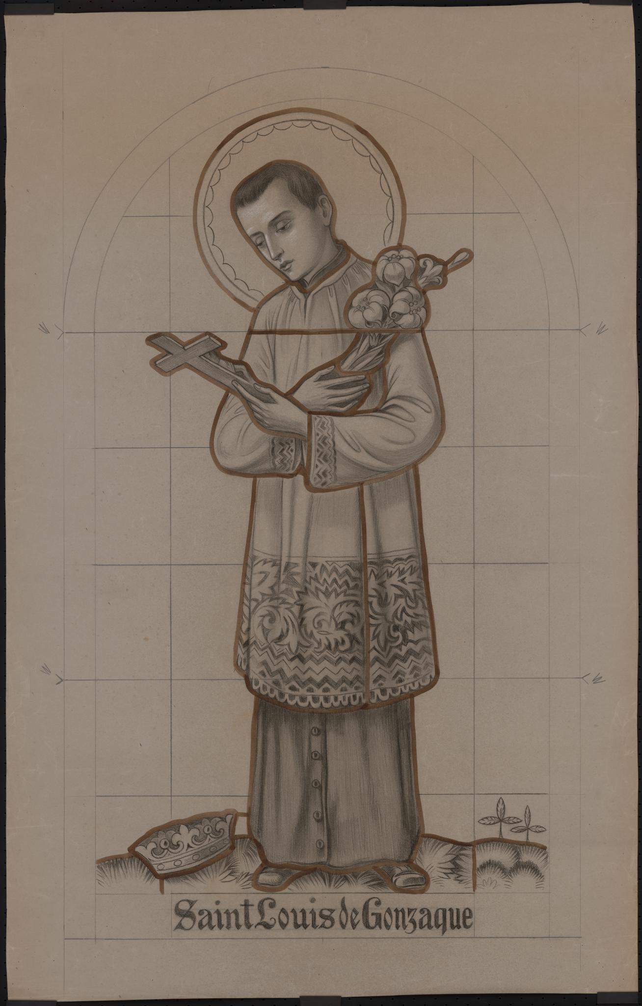 Ce carton en noir et blanc est un projet pour le vitrail de saint Louis de Gonzague, situé dans la troisième fenêtre à droite dans la nef de la chapelle Notre-Dame-de-la-Brillaz à Prez-vers-Noréaz. Ce petit sanctuaire, lieu de pèlerinage local, est édifié en 1926-1927 par l’architecte fribourgeois Léon Hertling (Lauper, 2012, p. 240). Douze petits vitraux ornent l’ensemble des fenêtres. C’est l’artiste-architecte Jean Crivelli (les trois maquettes KF_122, KF_162 et KF_163 sont signées de ses initiales JC) et l’atelier fribourgeois Kirsch & Fleckner qui en sont les auteurs. Le cycle date de la construction du bâtiment en 1927 (le vitrail de sainte Cécile est signé et daté en bas à droite : KIRSCH et FLECKNER / FRIBOURG . 1927.).