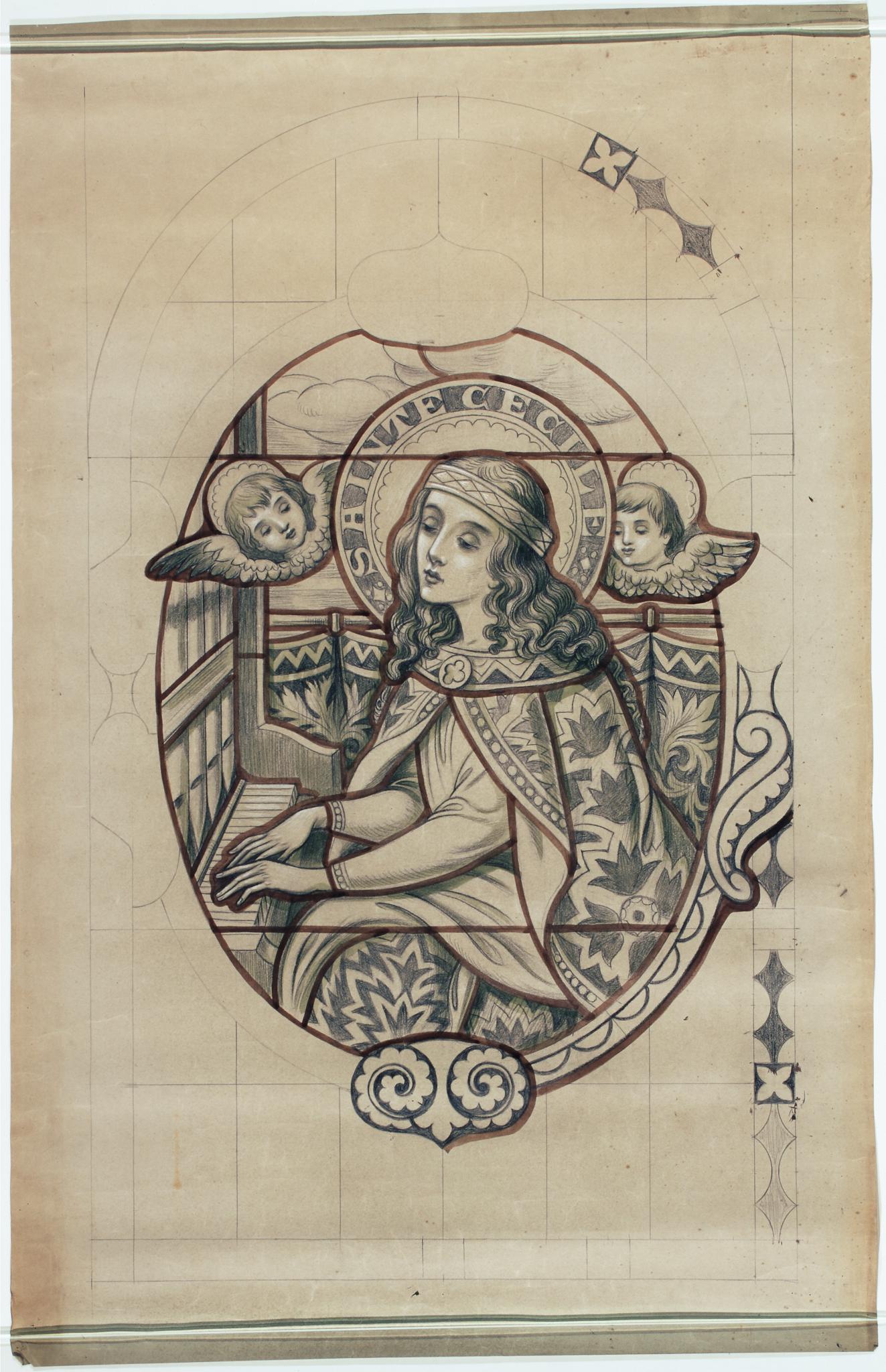 Ce carton en noir et blanc est un projet pour le vitrail de sainte Cécile, situé dans la deuxième fenêtre à droite dans la nef de la chapelle Notre-Dame-de-la-Brillaz à Prez-vers-Noréaz. Ce petit sanctuaire, lieu de pèlerinage local, est édifié en 1926-1927 par l’architecte fribourgeois Léon Hertling (Lauper, 2012, p. 240). Douze petits vitraux ornent l’ensemble des fenêtres. C’est l’artiste-architecte Jean Crivelli (les trois maquettes KF_122, KF_162 et KF_163 sont signées de ses initiales JC) et l’atelier fribourgeois Kirsch & Fleckner qui en sont les auteurs. Le cycle date de la construction du bâtiment en 1927 (le vitrail de sainte Cécile est signé et daté en bas à droite : KIRSCH et FLECKNER / FRIBOURG . 1927.).