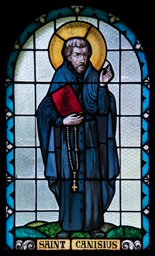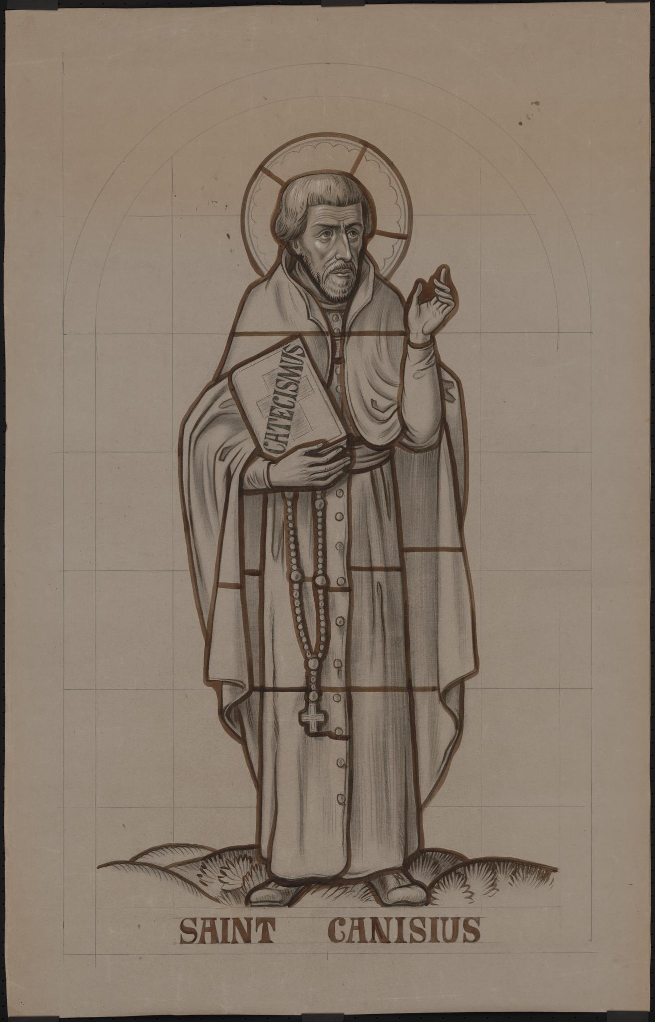 Ce carton en noir et blanc est un projet pour le vitrail de saint Pierre Canisius, situé dans la première fenêtre à gauche dans la nef de la chapelle Notre-Dame-de-la-Brillaz à Prez-vers-Noréaz. Ce petit sanctuaire, lieu de pèlerinage local, est édifié en 1926-1927 par l’architecte fribourgeois Léon Hertling (Lauper, 2012, p. 240). Douze petits vitraux ornent l’ensemble des fenêtres. C’est l’artiste-architecte Jean Crivelli (les trois maquettes KF_122, KF_162 et KF_163 sont signées de ses initiales JC) et l’atelier fribourgeois Kirsch & Fleckner qui en sont les auteurs. Le cycle date de la construction du bâtiment en 1927 (le vitrail de sainte Cécile est signé et daté en bas à droite : KIRSCH et FLECKNER / FRIBOURG . 1927.).