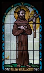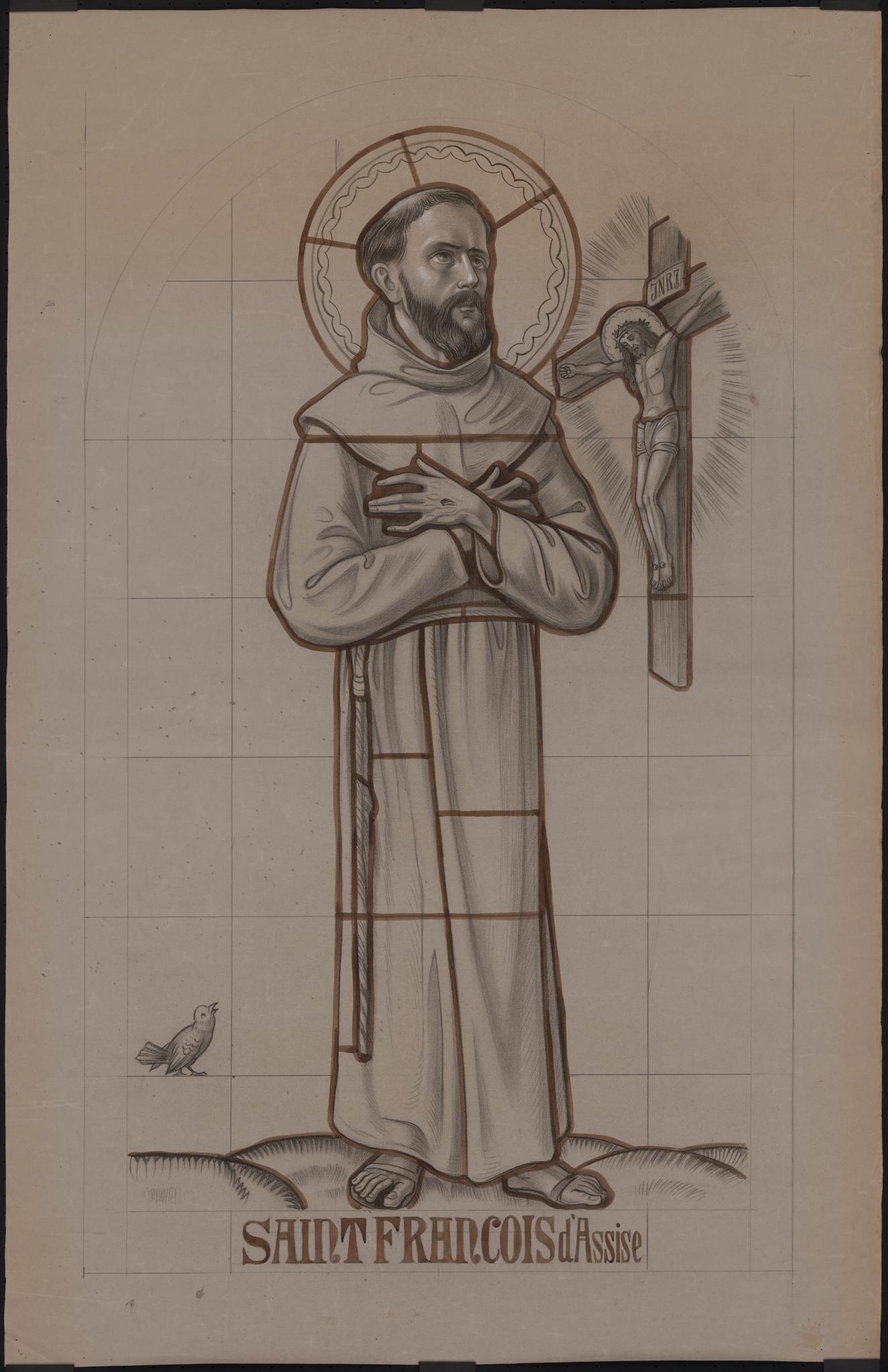Ce carton en noir et blanc est un projet pour le vitrail de saint François d’Assise, situé dans la troisième fenêtre à gauche dans la nef de la chapelle Notre-Dame-de-la-Brillaz à Prez-vers-Noréaz. Ce petit sanctuaire, lieu de pèlerinage local, est édifié en 1926-1927 par l’architecte fribourgeois Léon Hertling (Lauper, 2012, p. 240). Douze petits vitraux ornent l’ensemble des fenêtres. C’est l’artiste-architecte Jean Crivelli (les trois maquettes KF_122, KF_162 et KF_163 sont signées de ses initiales JC) et l’atelier fribourgeois Kirsch & Fleckner qui en sont les auteurs. Le cycle date de la construction du bâtiment en 1927 (le vitrail de sainte Cécile est signé et daté en bas à droite : KIRSCH et FLECKNER / FRIBOURG . 1927.).