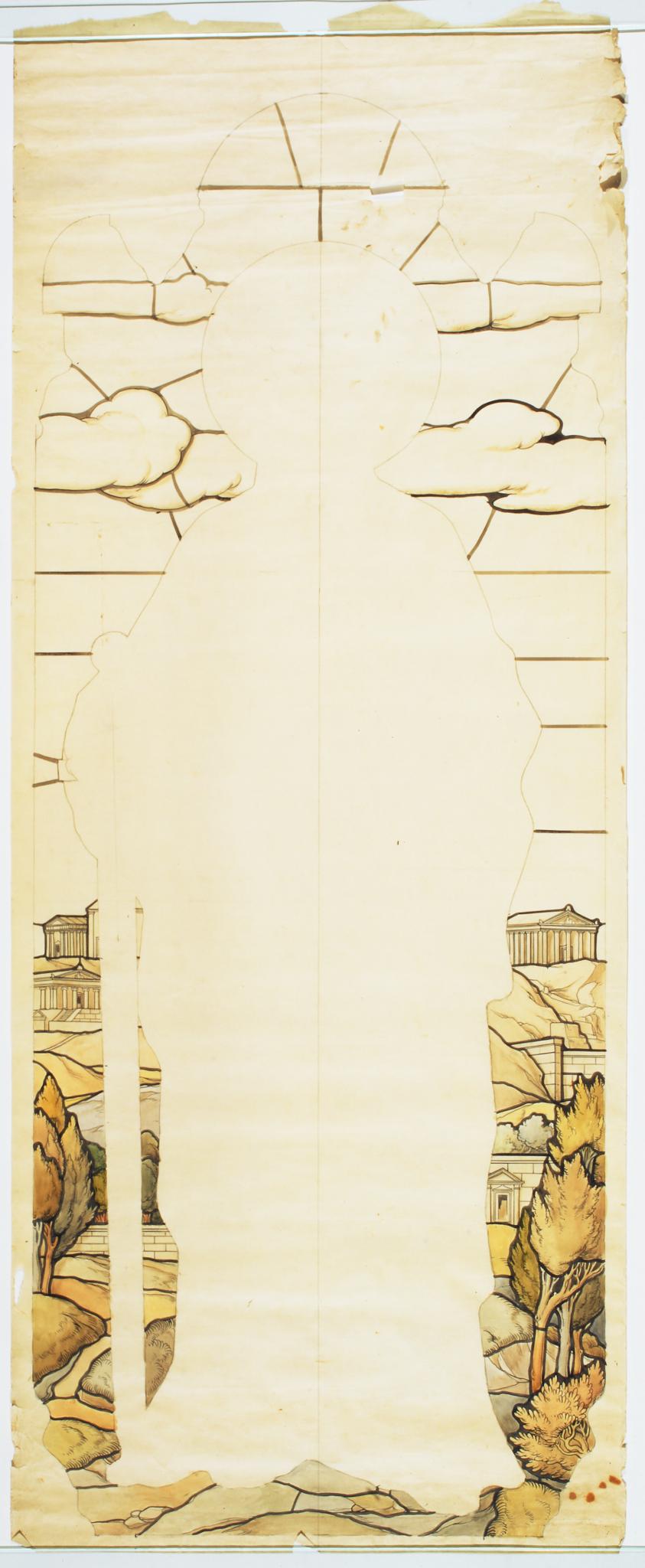 Ce carton en couleur est le modèle précis à l’échelle 1:1 de l’arrière-plan du vitrail consacré à saint Paul situé à droite de la fenêtre axiale de l’église Saint-André à Onnens. Toute la partie ornementale manque.