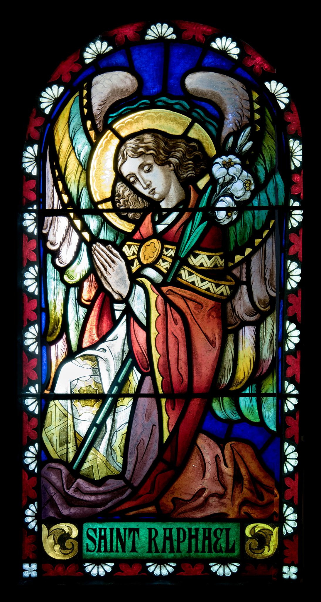 Ce vitrail consacré à l’archange Raphaël se situe à droite dans le choeur de la chapelle Notre-Dame-de-la-Brillaz à Prez-vers-Noréaz. Ce petit sanctuaire, lieu de pèlerinage local, est édifié en 1926-1927 par l’architecte fribourgeois Léon Hertling (Lauper, 2012, p. 240). Douze petits vitraux ornent l’ensemble des fenêtres. C’est l’artiste-architecte Jean Crivelli (trois maquettes pour cette chapelle issues du Fonds graphique de l’atelier Kirsch & Fleckner KF_122, KF_162 et KF_163 sont signées de ses initiales JC) et l’atelier fribourgeois Kirsch & Fleckner qui en sont les auteurs. Le cycle date de la construction du bâtiment en 1927 (le vitrail de sainte Cécile est signé et daté en bas à droite : KIRSCH et FLECKNER / FRIBOURG . 1927.).