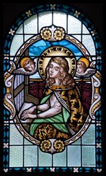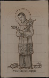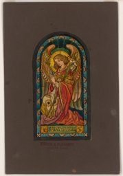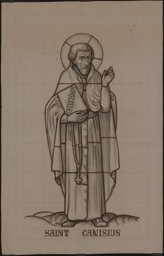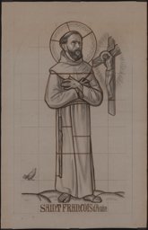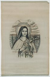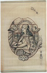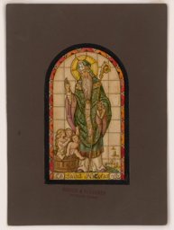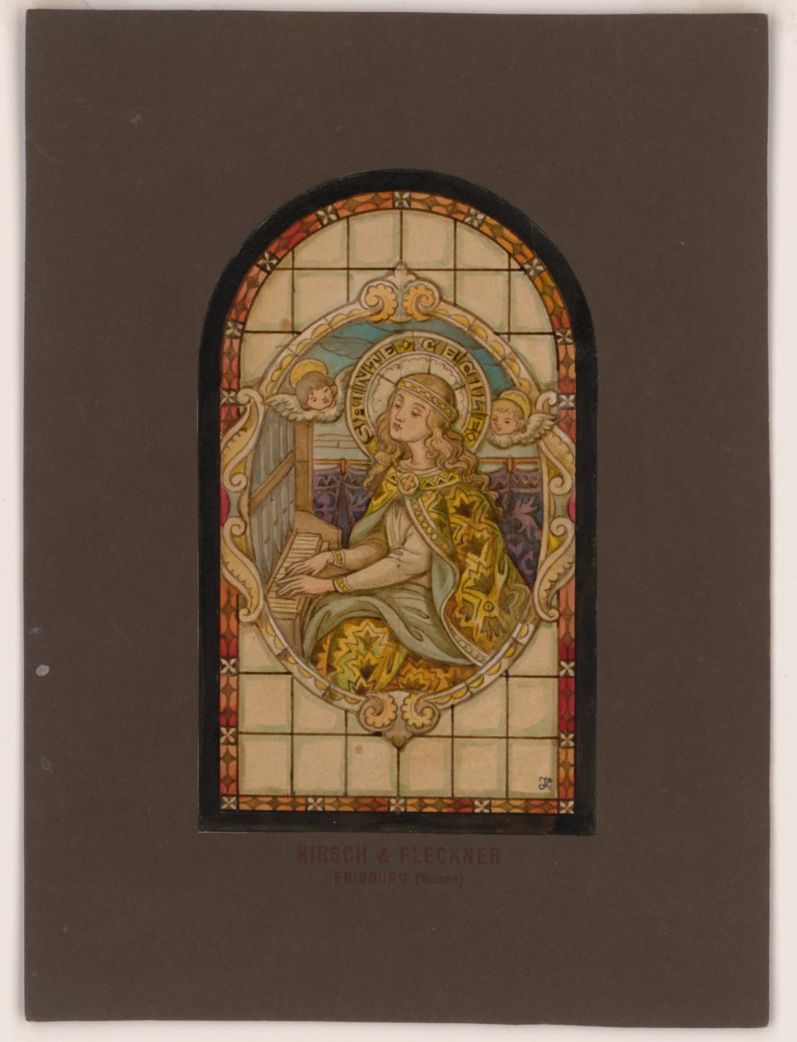Cette maquette en couleur est un projet pour le vitrail de sainte Cécile, situé dans la deuxième fenêtre à droite dans la nef de la chapelle Notre-Dame-de-la-Brillaz à Prez-vers-Noréaz. Ce petit sanctuaire, lieu de pèlerinage local, est édifié en 1926-1927 par l’architecte fribourgeois Léon Hertling (Lauper, 2012, p. 240). Douze petits vitraux ornent l’ensemble des fenêtres. C’est l’artiste-architecte Jean Crivelli (les trois maquettes KF_122, KF_162 et KF_163 sont signées de ses initiales JC) et l’atelier fribourgeois Kirsch & Fleckner qui en sont les auteurs. Le cycle date de la construction du bâtiment en 1927 (le vitrail de sainte Cécile est signé et daté en bas à droite : KIRSCH et FLECKNER / FRIBOURG . 1927.).